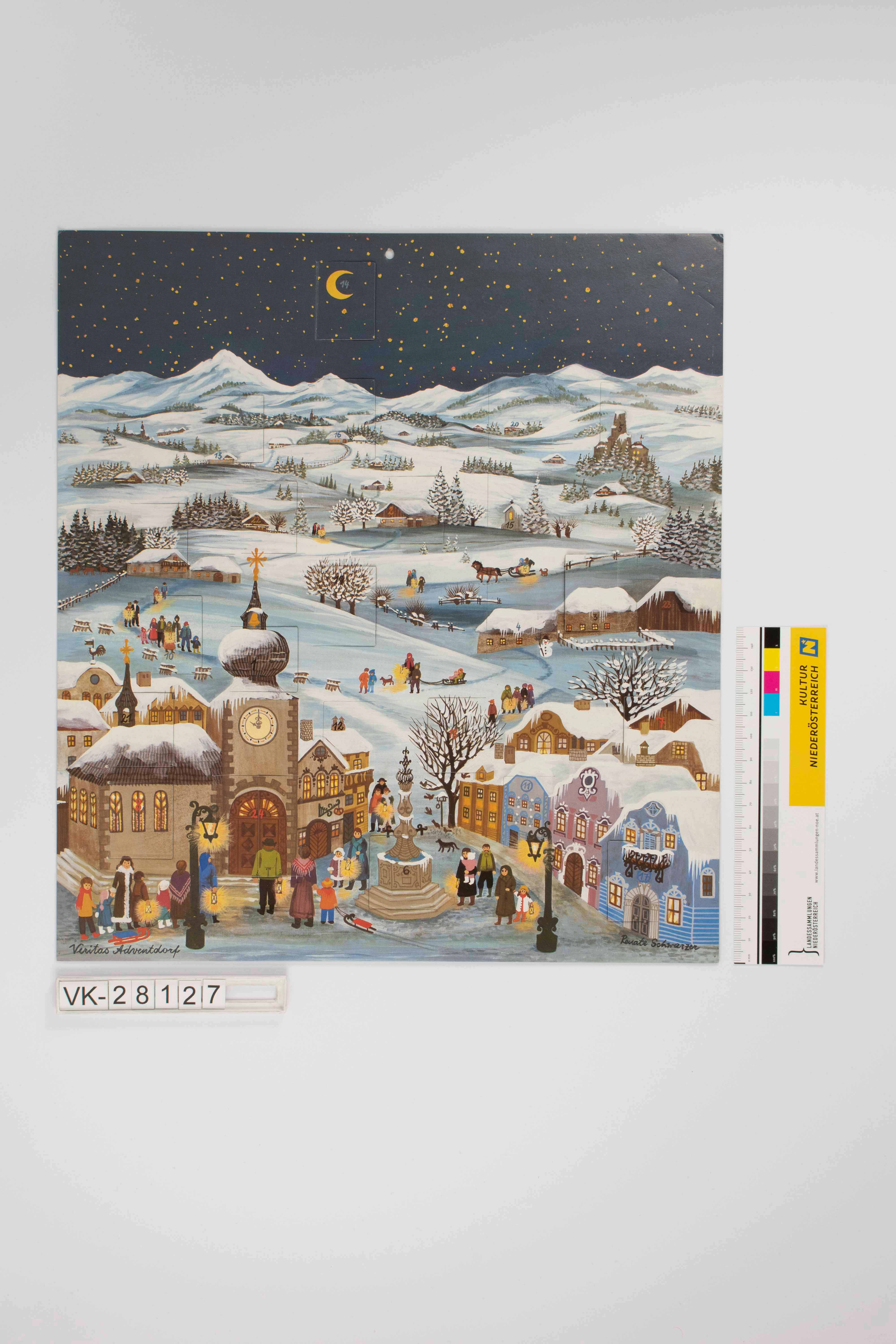 Hängeadventkalender mit gestanzter Lochung oben mittig (0,4 cm) und Winterlandschaft; verschneite, hügelige Landschaft mit Dorfplatz und Kirche im Vordergrund, vereinzelte Häuser und Höfe im Hintergrund und Sternenhimmel; Menschen mit Laternen vor der bzw. am Weg in die Kirche; hochformatige, rechteckige gestanzte Türchen; rechts unten: Renate Schwarzer, links unten beschriftet mit Veritas Adventdorf.