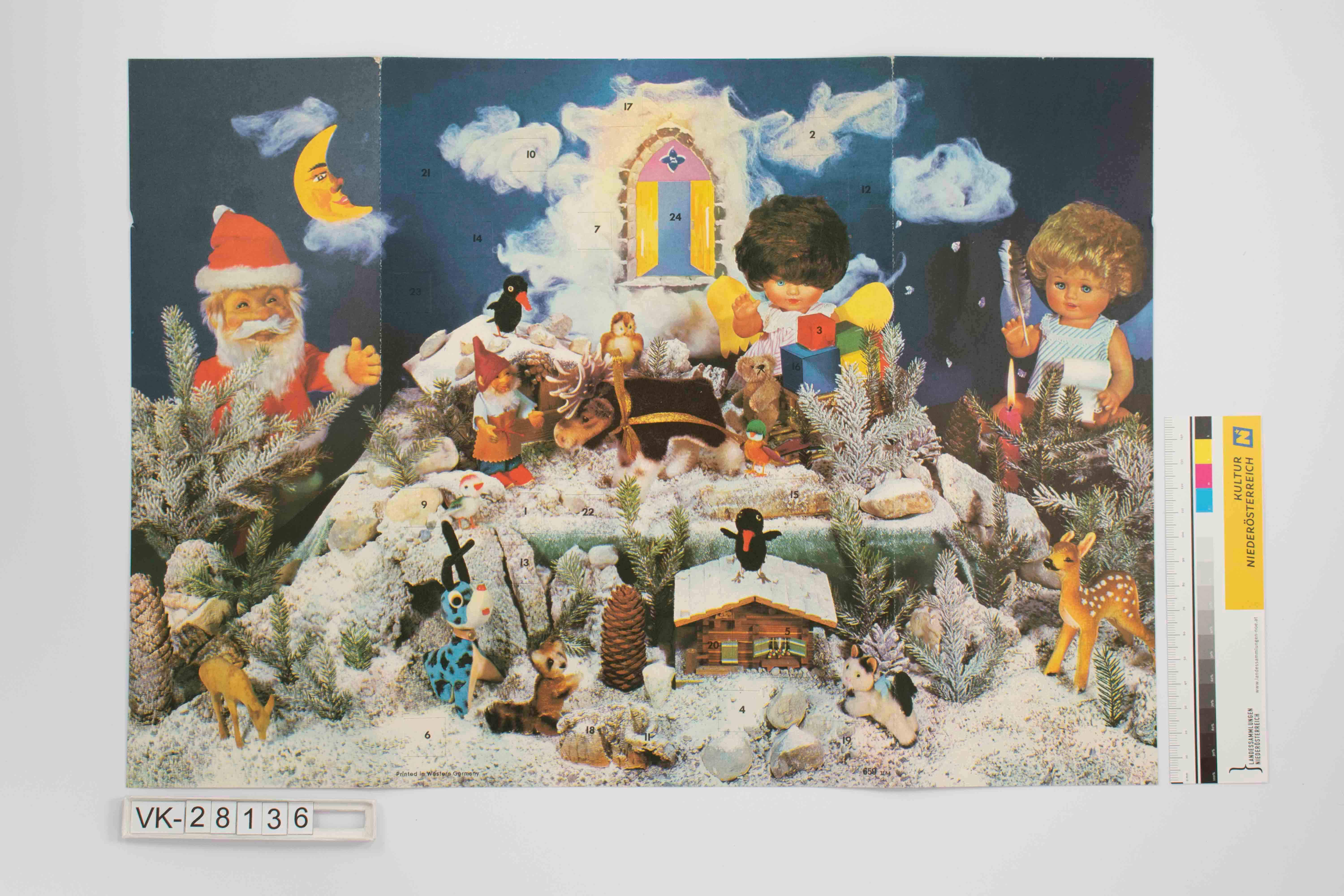 Stelladventkalender mit zwei seitlichen Flügeln (je ca. 10,4 cm); Fotomotiv mit Schneelandschaft, Puppen, Weihnachtsmann und Tieren, dazwischen Tannenzweige und -zapfen; Nummerierung mittig rechts unten: 659 ILM und mittig links unten der Herkunftshinweis WestDeutschland; auf der Rückseite Firmenstempel der Papierhandlung Schäffer/Favoritenstraße.
