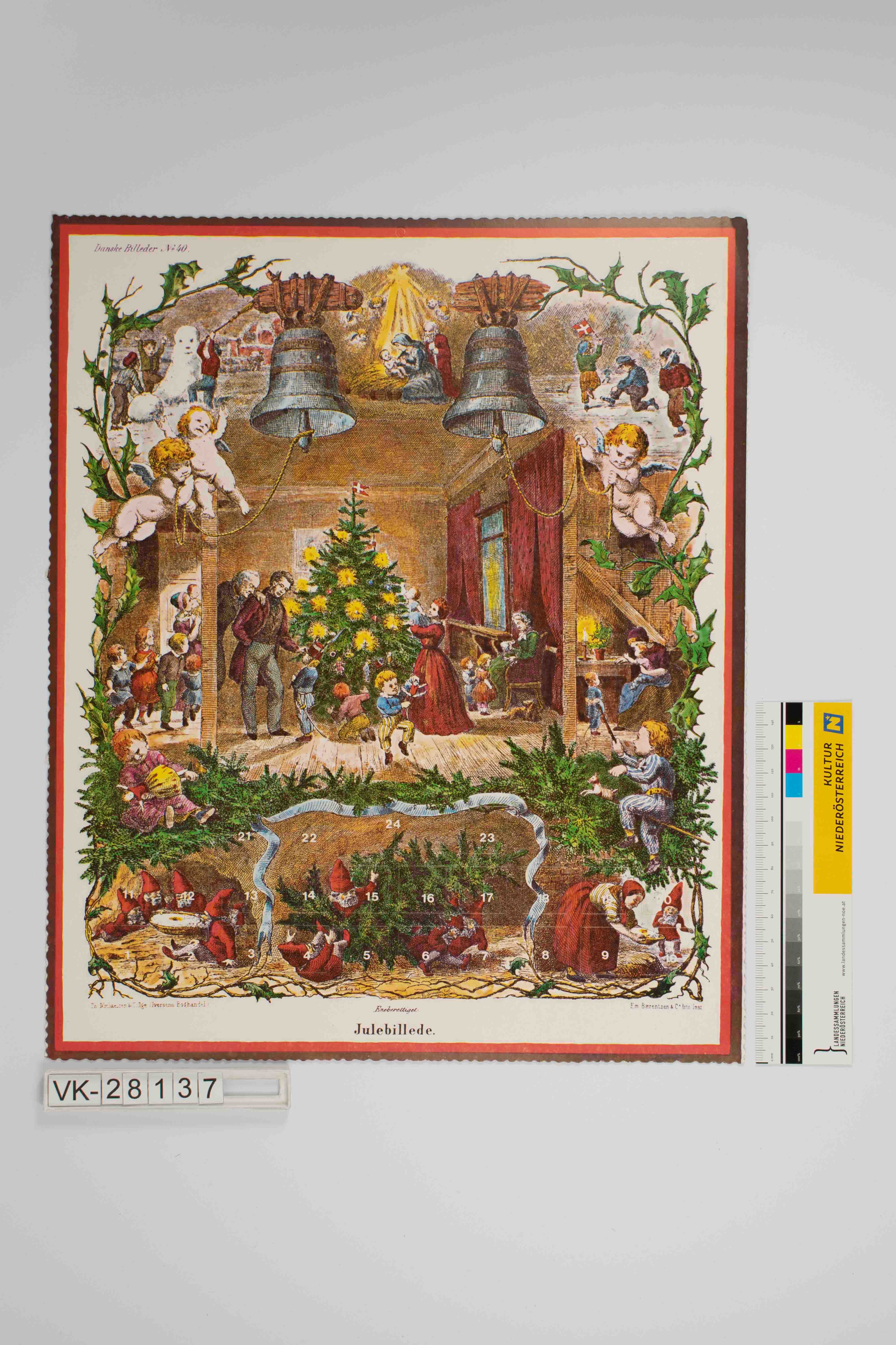 Hängeadventkalender, Hochformat mit Weihnachtsbild von H. C. Ley; mittig mit Girlanden umrahmte Familie um Christbaum, darunter Kobolde mit Reisbrei, oben Krippenszene, zwei große, von Engeln geläutete Glocken und spielende Kinder; mittig oben gestanzte Lochung zum Aufhängen, im unteren Drittel quadratische Türchen; links oben Beschriftung: Danske Billeder N° 40, unten Originalbeschriftungen des Bildes sowie: Julebillede; auf der Rückseite ausführliche Informationen.