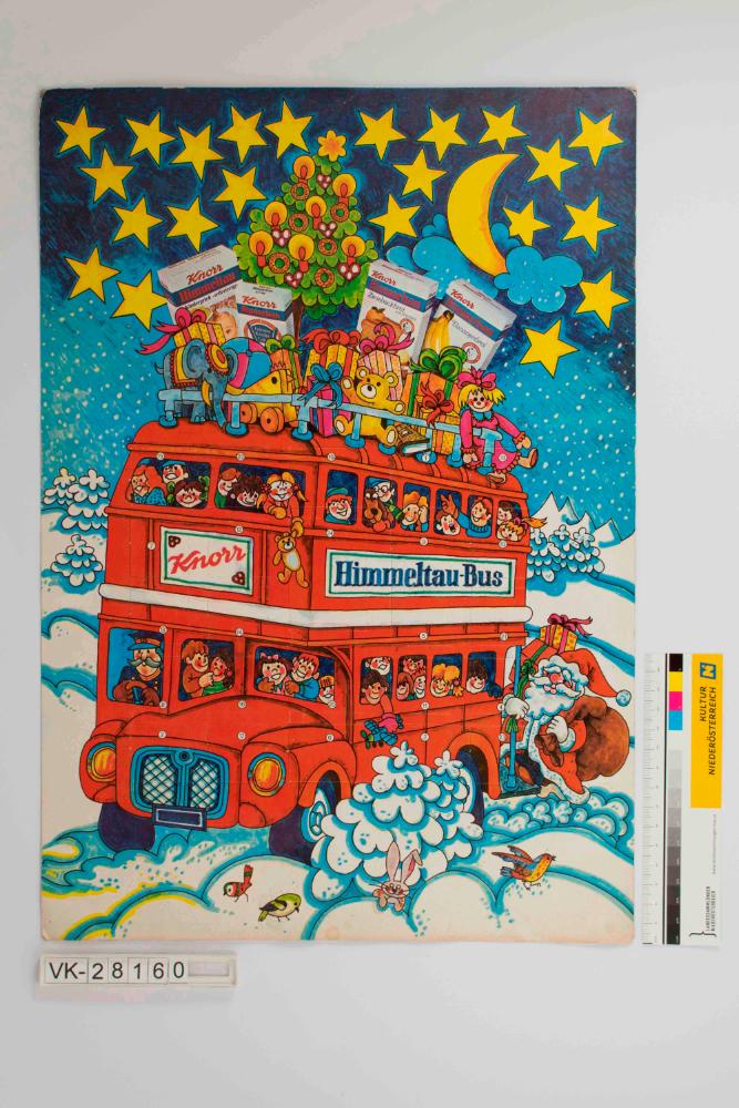 Adventkalender, Hochformat mit rotem Bus (Beschriftung: Knorr Himmeltau Bus) voller Kinder und Weihnachtsgeschenke samt Christbaum und Weihnachtsmann in Winterlandschaft unter Sternenhimmel mit Mond; viereckige Türchen; Werbeprodukt der Firma Knorr, Logo auf dem Bus, Himmeltau Packungen zwischen den Geschenken.