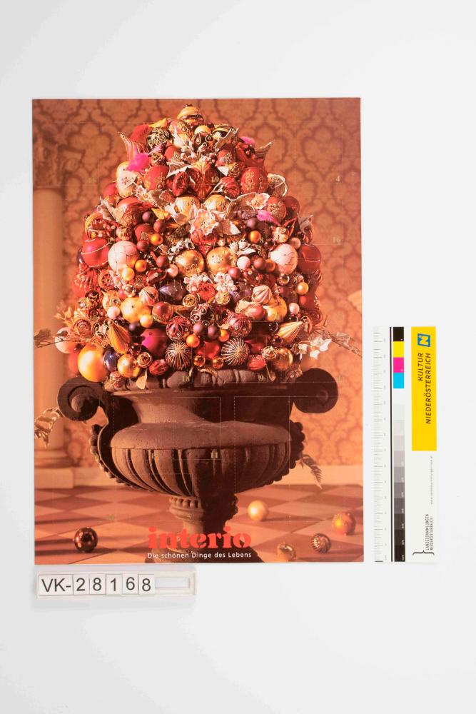 Adventkalender, Hochformat, mit Gesteckarrangement mit goldbeglitzerten Christbaumkugeln in graugebranntem Keramikgefäß; viereckige Türchen mit goldener Beschriftung, dahinter Geschenksideen von Interio; unten mittig Werbeschriftzug, Werbeprodukt der Firma Interio; auf der Rückseite Informationen über eine Werbeaktion.