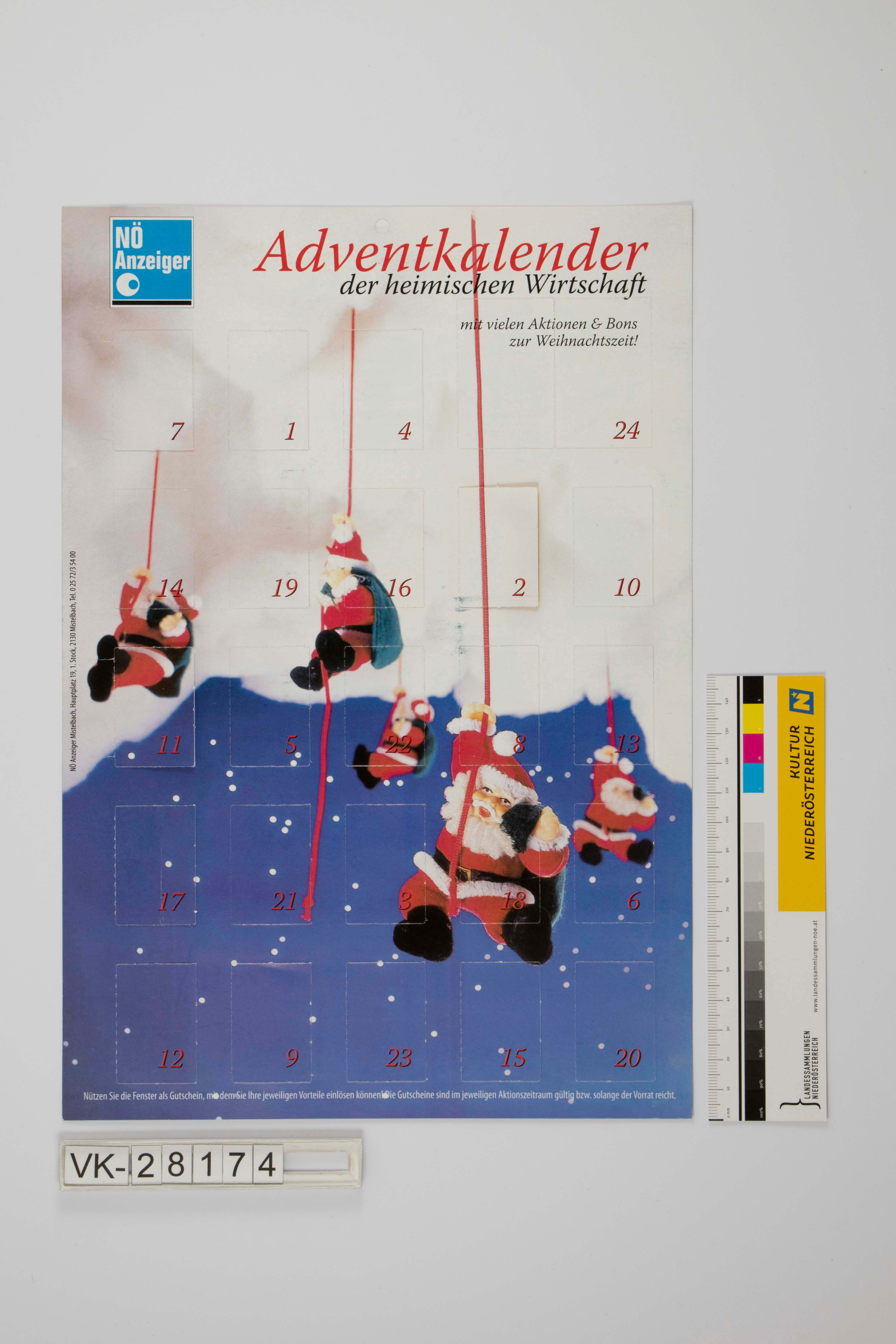Hängeadventkalender, Hochformat; Adventkalender der heimischen Wirtschaft mit Aktionen und Bons hinter den Türchen, Fotografie von hängenden Weihnachtsmannfiguren; Logo des NÖ Anzeigers oben links, Aufhängelochung oben mittig und Herkunftsangaben seitlich links, auf der Rückseite Rezept.
