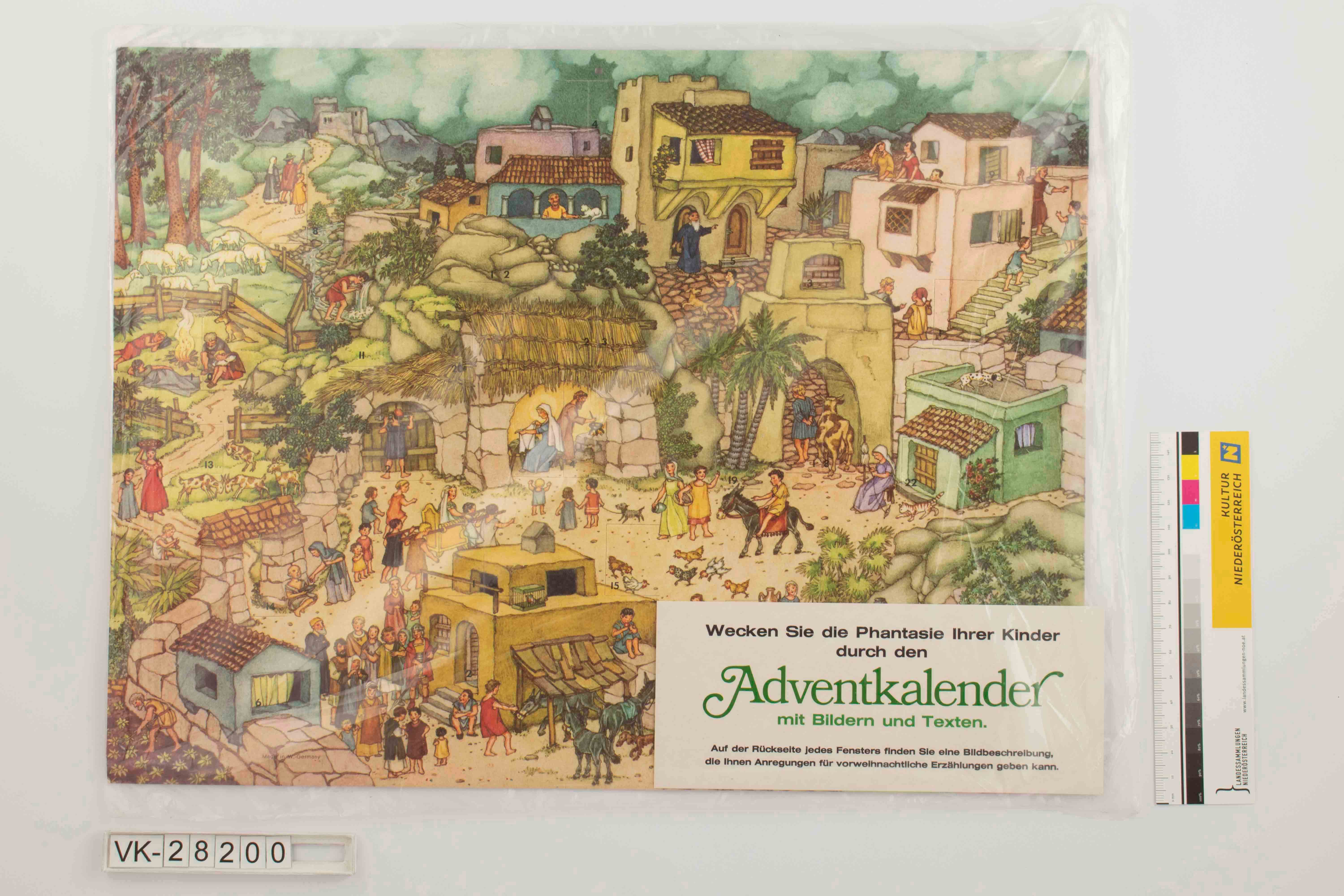 Hängeadventkalender, Querformat mit Szenen aus dem Heiligen Land bzw. der Bibel und Jesu Leben; mittig strohgedeckter Stall mit kochendem Josef und Maria mit Tuch und Futterkrippe; viereckige Türchen und oben mittig gestanzte Aufhängelochung, hinter den Türchen Bild mit Beschreibung als „Anregungen für vorweihnachtliche Erzählungen“; mitverpackter Zettel mit Erklärung; links bzw rechts unten Herkunftsangabe und Nummer 544.