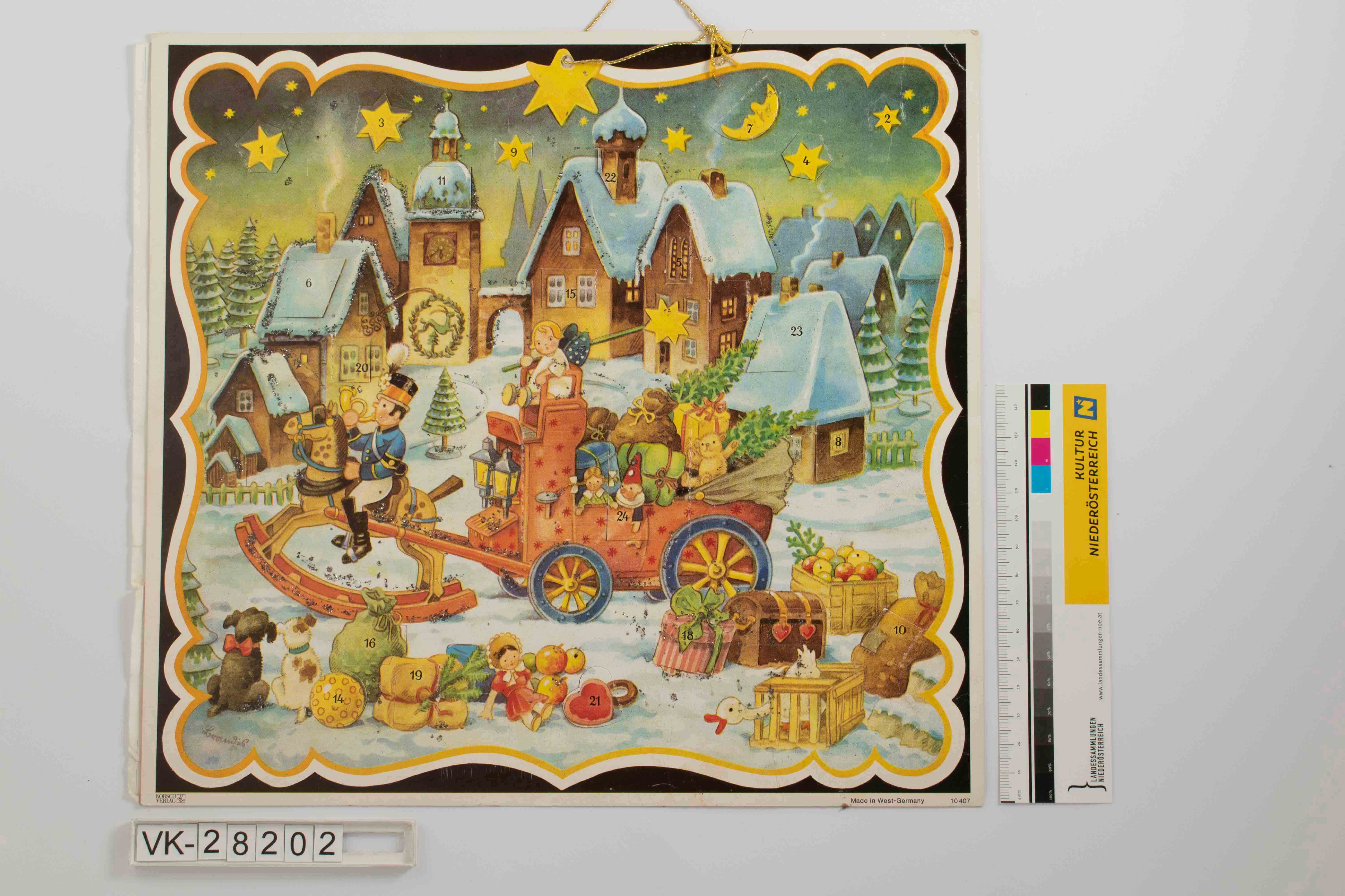 Hängeadventkalender, Querformat mit gestanzter Aufhängelochung und goldener Schnur oben mittig; Motiv von Brandes mit Spielzeugkutsche in winterlicher Stadtkulisse, vordergründig Spielzeug und im Hintergrund Winterwald und Sternenhimmel; Bild gelb-weiß-schwarz umrandet und silber beglimmert; unregelmäßig geformte Türchen; links unten Verlagslogo, rechts unten Herkunftsangabe und Nummer 10 407.