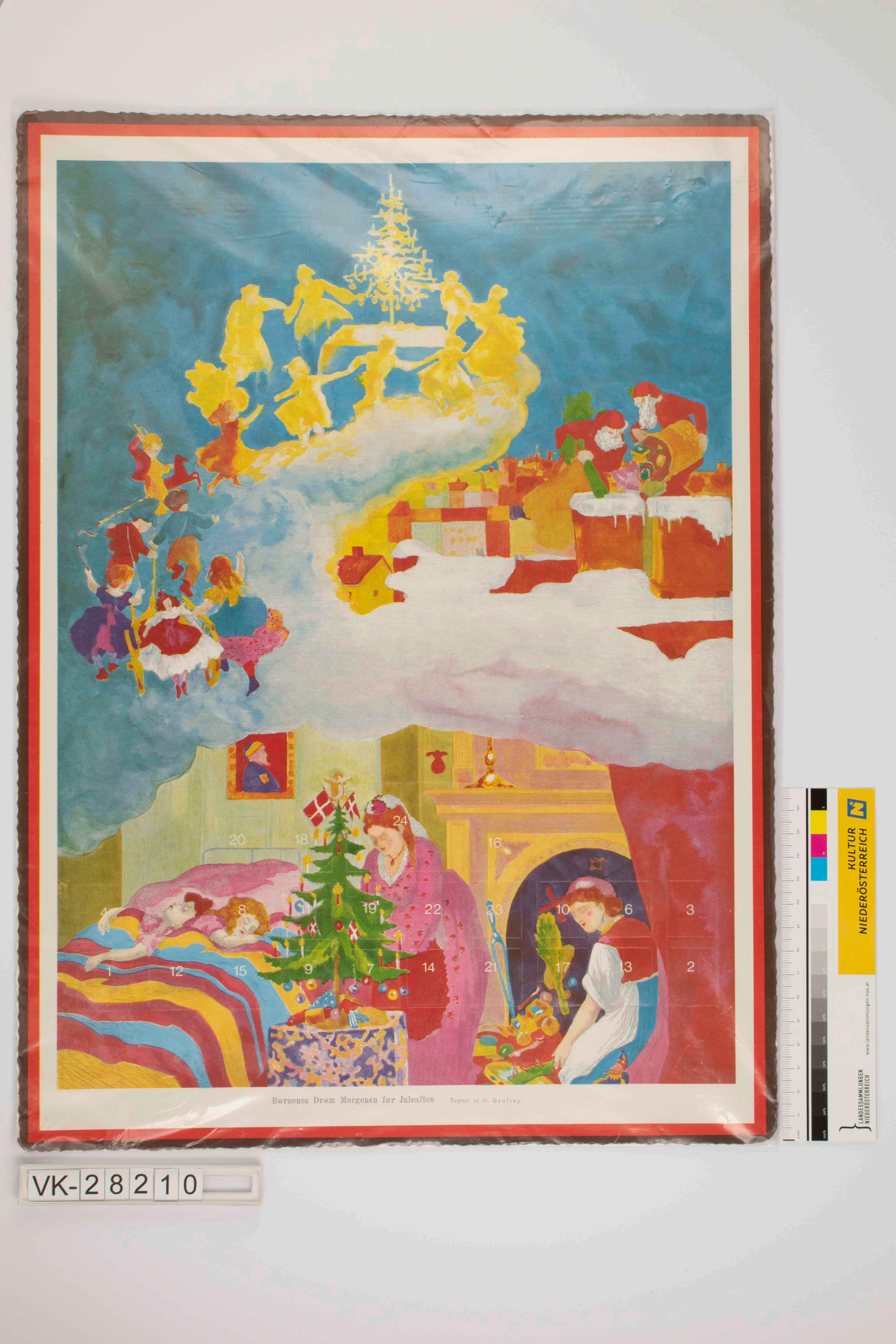 Adventkalender, Hochformat mit gewelltem Rand und einem Bild von Broling auf welchem Mutter und Dienstmädchen den Christbaum schmücken während zwei Kinder daneben schlafen, in der oberen Bildhälfte ist der Traum der Kinder dargestellt; unten Bildbeschriftung, rückseitig Erläuterungen zum Bild und Weihnachtsglückwünsche sowie Herstellerangaben; Nummer 1359.