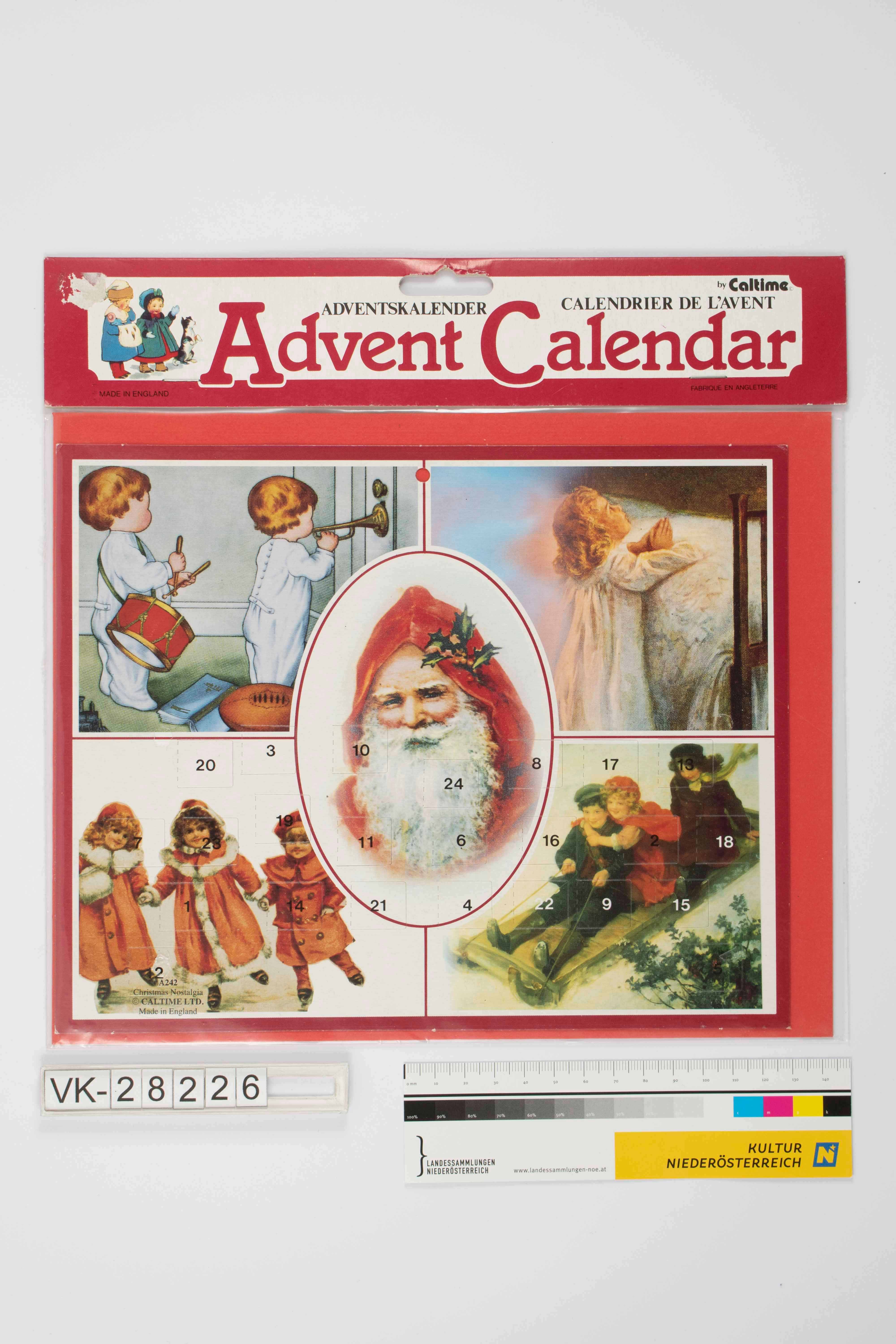 Als großformatige Postkarte gestalteter Adventkalender in Querformat mit beigelegtem rotem Kuvert; mittig Weihnachtsmann mit Mistelzweig auf der Kapuze, umrandet von vier Kästchen mit weihnachtlicher/winterlicher Motivik: musizierende Kinder im Pyjama, ein betendes Kind, schlittschuhfahrende Kinder und rodelnde junge Menschen; in der unteren Hälfte Adventkalendertürchen; rechts unten Herstellerangaben, Christmas Nostalgia und die Nummer 12 A242.