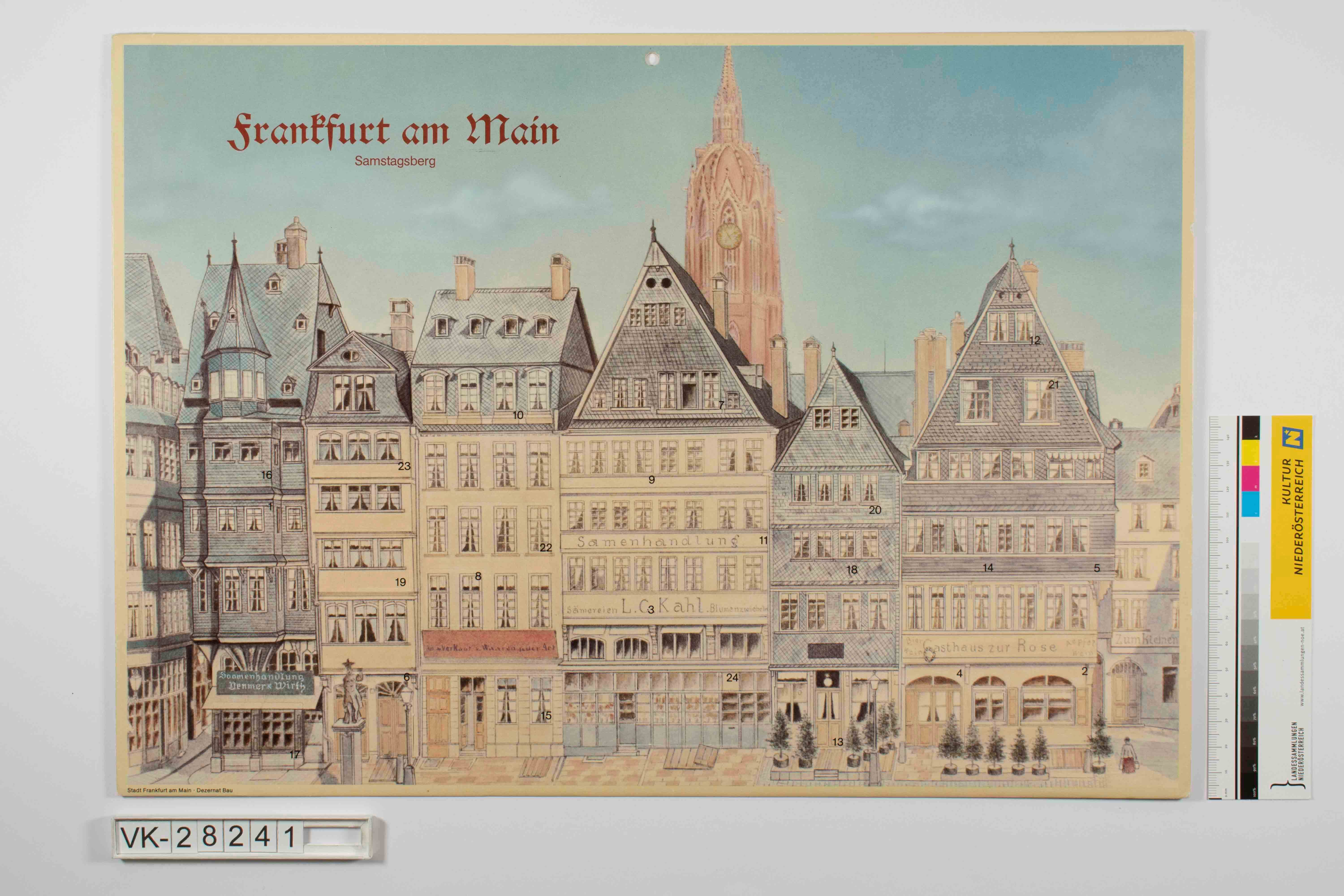 Hängeadventkalender, Querformat mit mittiger Aufhängelochung oben; Darstellung Hausfassade Frankfurt am Main, Samstagsberg vor blauem Himmel; viereckige Türchen; links unten Herkunftsangaben; ein weiteres Exemplar dieses Kalenders unter VK-28240 vorhanden.