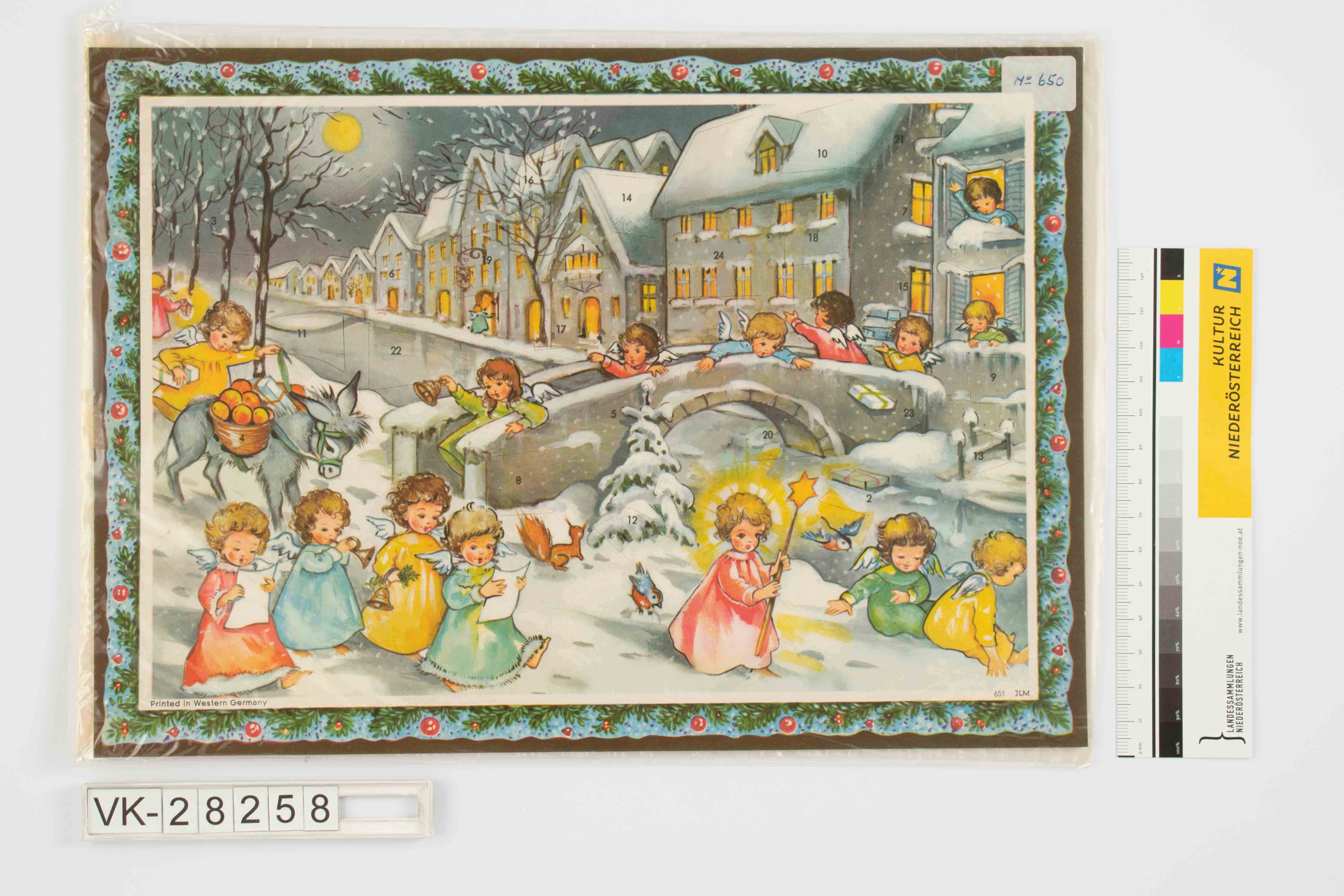 Adventkalender, Querformat; Bild mit vielen Engelchen vor Fluss mit Brücke und hintergründiger Häuserreihe in weiß-schwarzer Umrahmung mit Tannenzweigmotivik; Engelchen in verschneiter Winterlandschaft welche musizieren, spazieren und winken; mit bepacktem Eselchen mit Früchten und Geschenken; rechts unten Aufdruck 651 JLM, links unten Herkunftsangabe Western Germany; rechts oben Aufkleber mit Nr. 650, vgl. VK-28260.