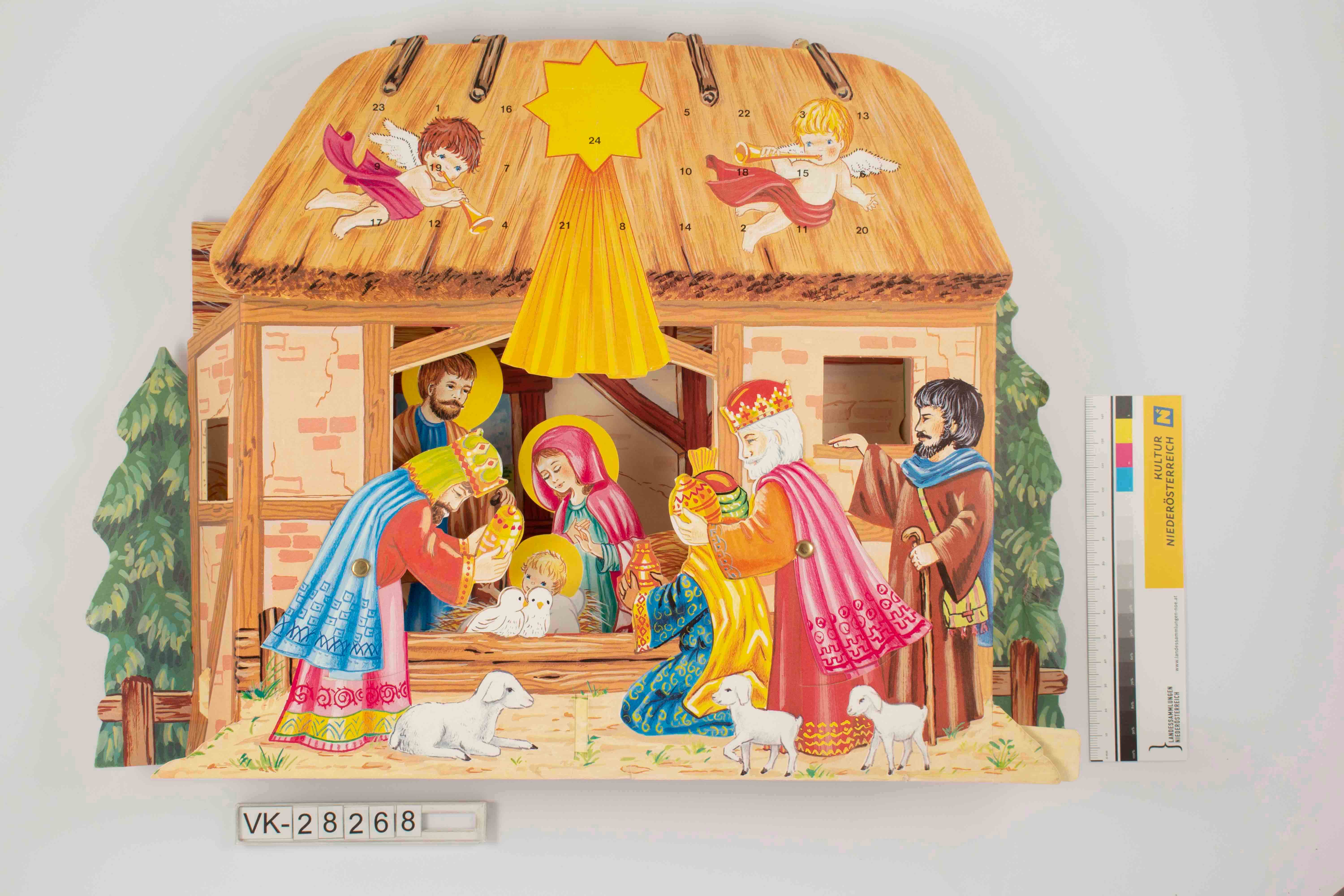 Dreidimensionaler, beweglicher Aufstelladventkalender in Form eines Stalles mit Krippenszene; strohgedecktes Fachwerkgebäude mit Heiliger Familie und Gaben darbringenden Heiligen Drei Königen sowie einem Hirten mit Schafen; über dem Dach Engelchen mit Trompeten sowie Stern; innen beschriftet mit M und Herkunftsangabe Dänemark und Nummer 10 88 07.
