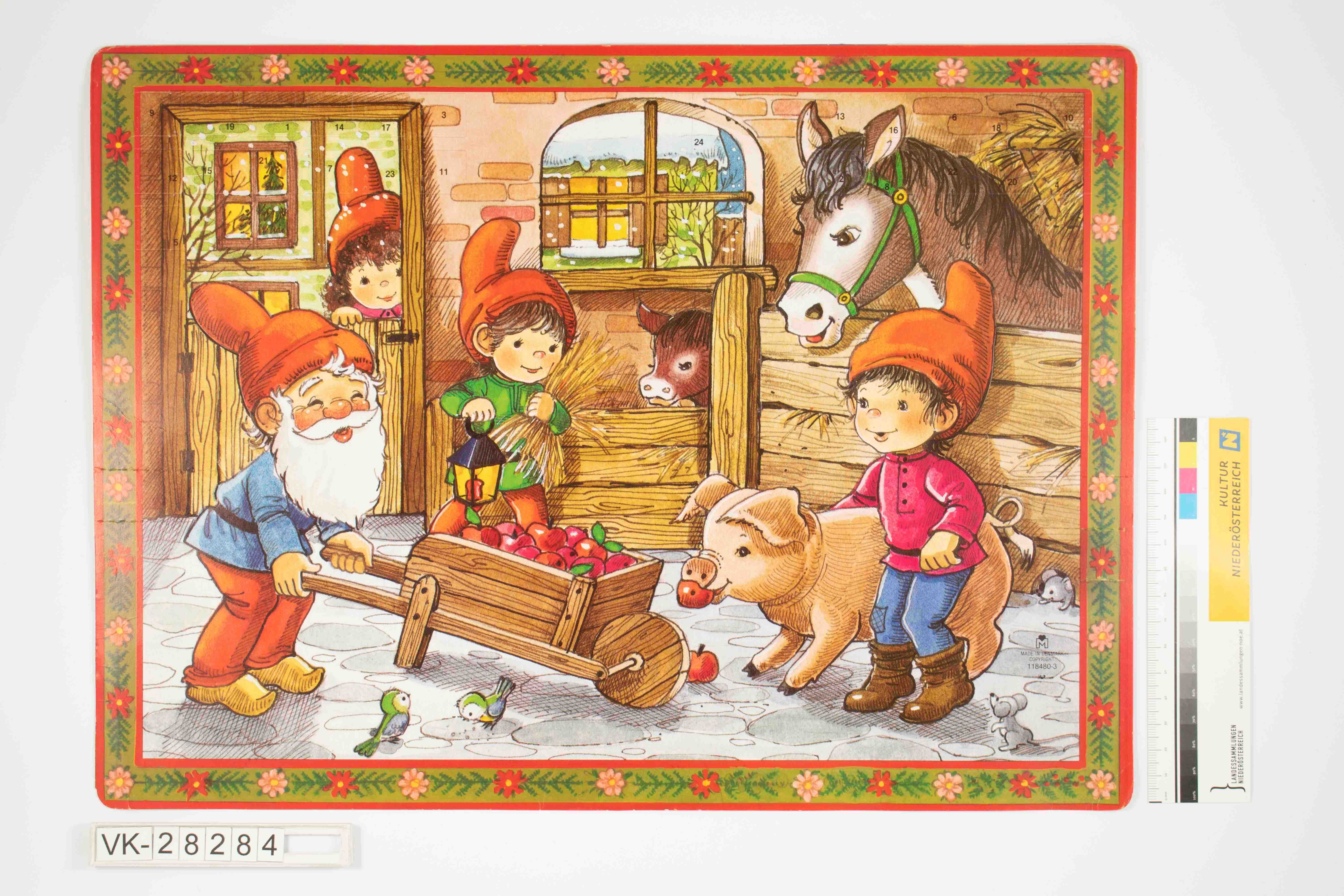 Dreidimensionaler Hängeadventkalender, Querformat, mit mittiger Aufhängelochung und Bild von Stallszene mit Wichteln beim Füttern der Tiere; drei junge und ein alter rotbemützte Wichtel füttern Pferd, Schwein und Kalb mit Äpfeln in hölzernem Stall; durch Fenster und Türen Blick auf Schneeflocken und gegenüberliegendes Haus mit hell erleuchteten Fenstern und Nadelbaum; Türchen sind quadratisch und links und rechts in der oberen Bildhälfte regelmäßig angeordnet; Bild mit Blumen-Tannenmotiv umrandet und rechts unten Herstellerangaben.