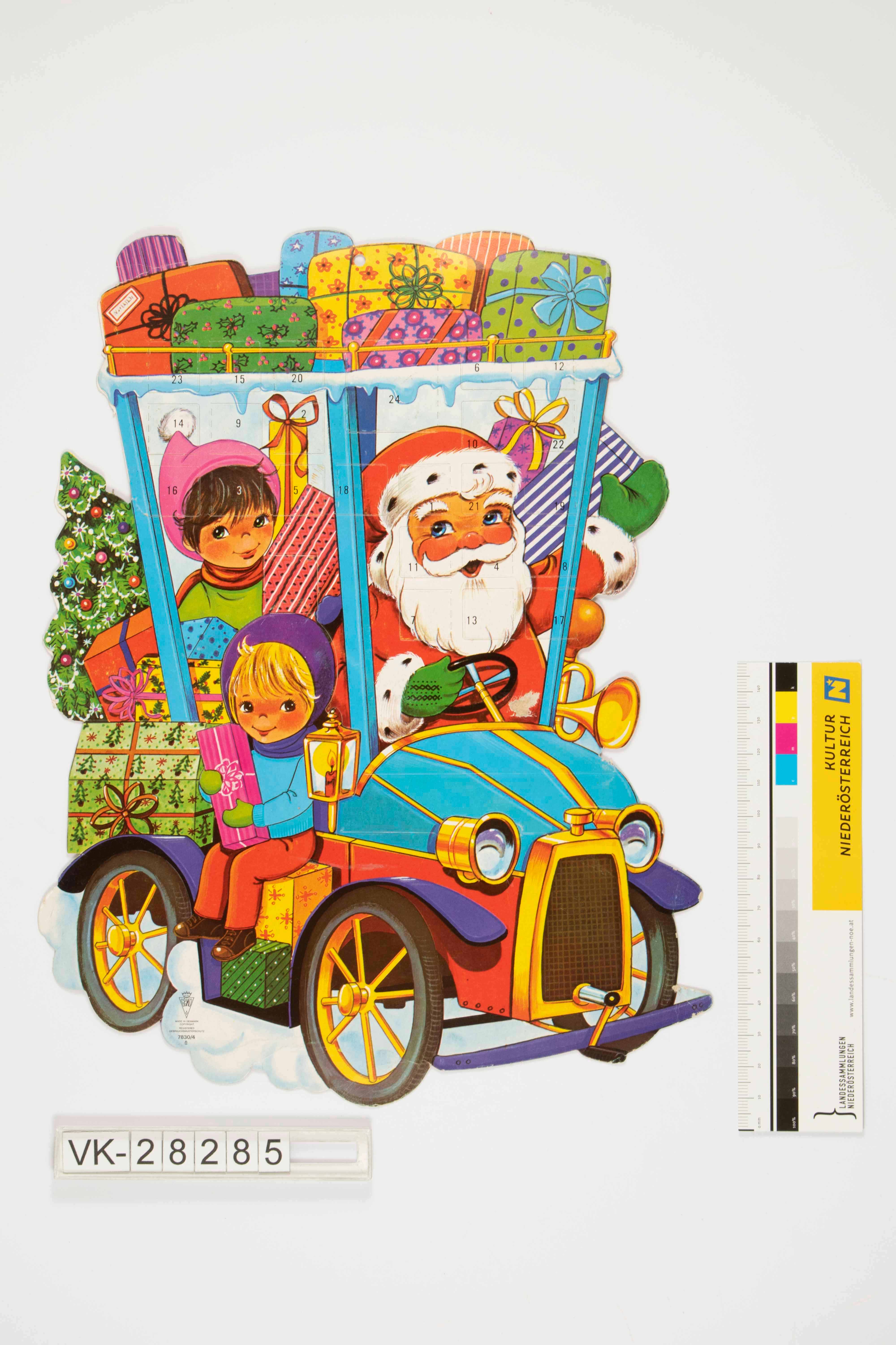 Dreidimensionaler Hängeadventkalender in Form eines voll bepackten blauen Autos mit Weihnachtsmann und Kindern im Inneren; am Dachträger und im Auto eine Menge Weihnachtspakete und ein Christbaum; Kinder in Winterkleidung und Weihnachtsmann am Steuer; dreidimensional aufklappbar, mit quadratischen Türchen in oberer Bildhälfte; Herstellerangaben und Nummer 7830/4 links unten.