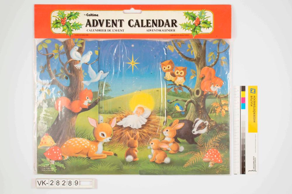 Dreidimensionaler Aufstelladventkalender mit akkordeonförmig ausklappbaren Seitenflügeln; Bild von herbstlicher Hügellandschaft mit mittiger Krippe mit Jesus-Kind; links und rechts Bäume und Waldtiere welche die Krippe umringen in der das schlafende Kind mit Heiligenschein liegt; darüber Sternenhimmel; links unten weiß gedruckte Herstellerangaben und die Nummer S128; quadratische Türchen mittig über das Bild verteilt.