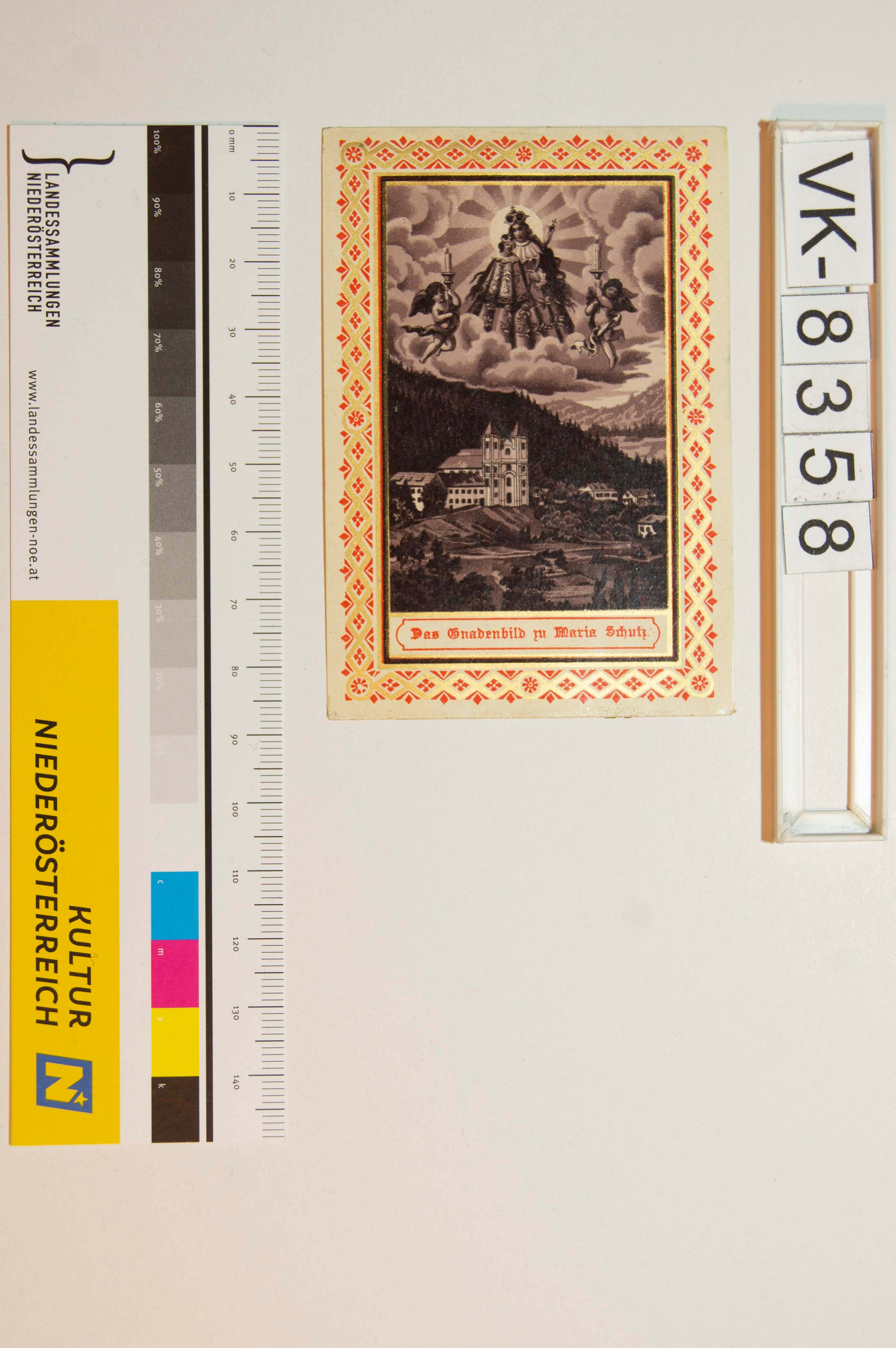 Maria mit Jesuskind über Kirche Maria Schutz, " Das Gnadenbild zu Maria Schutz", Rückseite: Gebet