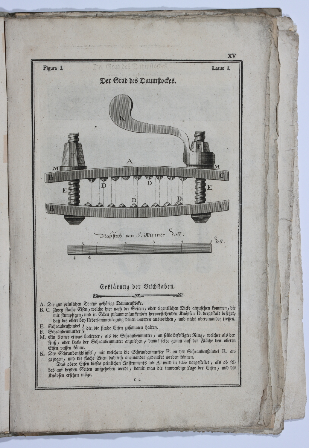 Beilagen zum ersten Teil der Constitutio Criminalis Theresiana: "Numerus IIItus ad Articuli XXXVIIIvi §phum XVII Abschilder-und Beschreibung der Peinigungsarten, wie selbe in der königl. böhmischen Hauptstadt Prag bey den daselbstigen Stadt-Magistraten vorgenommen werden." und "Numerus IVtus ad Articuli XXXVIIIvi §phum XVIImum Abschilder-und Erklärung der Peinigungsarten, wie selbe in der kaiserl. königl. Residenzstadt Wienn bey dem kaiserl. königl. Stadt- und Landgericht vorgenommen werden."