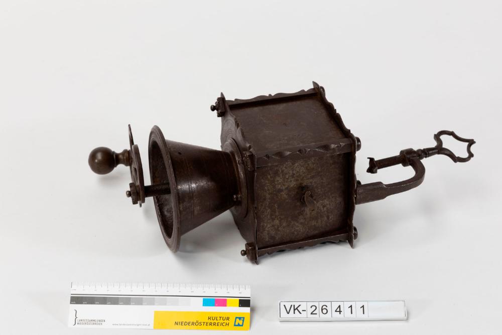Kaffeemühle mit einem kubischen Korpus, einer kleinen Lade und einem konischen Trichter. Das Mahlwerk wird über eine verzierte Kurbel bedient, die Mühle lässt sich über eine Schraubklemme an einer Tischplatte fixieren.
