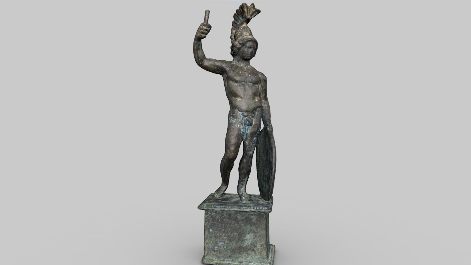 Der Gott steht auf dem linken Bein, das rechte ist leicht abgewinkelt und seitlich zurückgestellt. Die erhobene rechte Hand umfasst ein Fragment einer Lanze, während die gesenkte linke Hand den langovalen, profilierten Schild am oberen Rand hält. Der Kopf ist leicht nach unten links geneigt. Auf dem Kopf sitzt ein korinthischer Helm mit Nasen- und Augenöffnung, einem hohen, mächtigen Busch sowie seitlicher Ranken- und Spiralverzierung. Der Kopf wird von einem gelockten Haarkranz gerahmt. Das quaderförmige Postament weist oben und unten eine schmale, stufenförmige Profilierung auf.