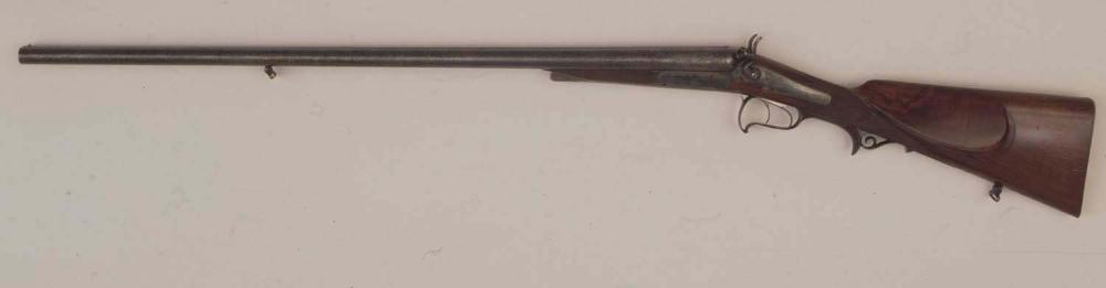 Doppelläufige Bockflinte mit zwei Perkussionsschlössern, offener Visiserung und zwei Abzügen. Läufe aus Damaszenerstahl.