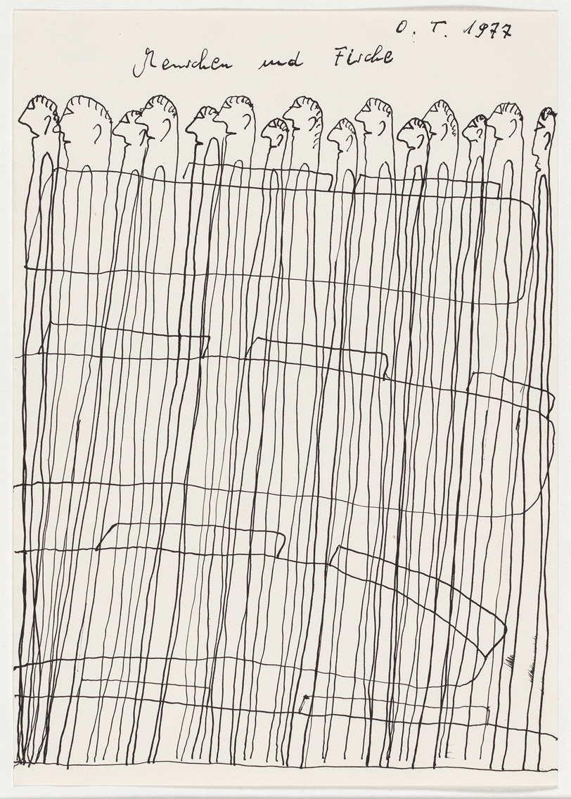 SignaturVS ob. bez., sign. u. dat.: "Menschen und Fische, O.T. 1977"