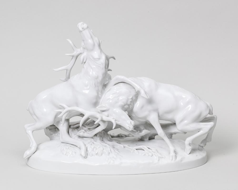 Genredarstellung zweier Hirsche im Kampf. Augarten, Wien, Modellnr. 1789
