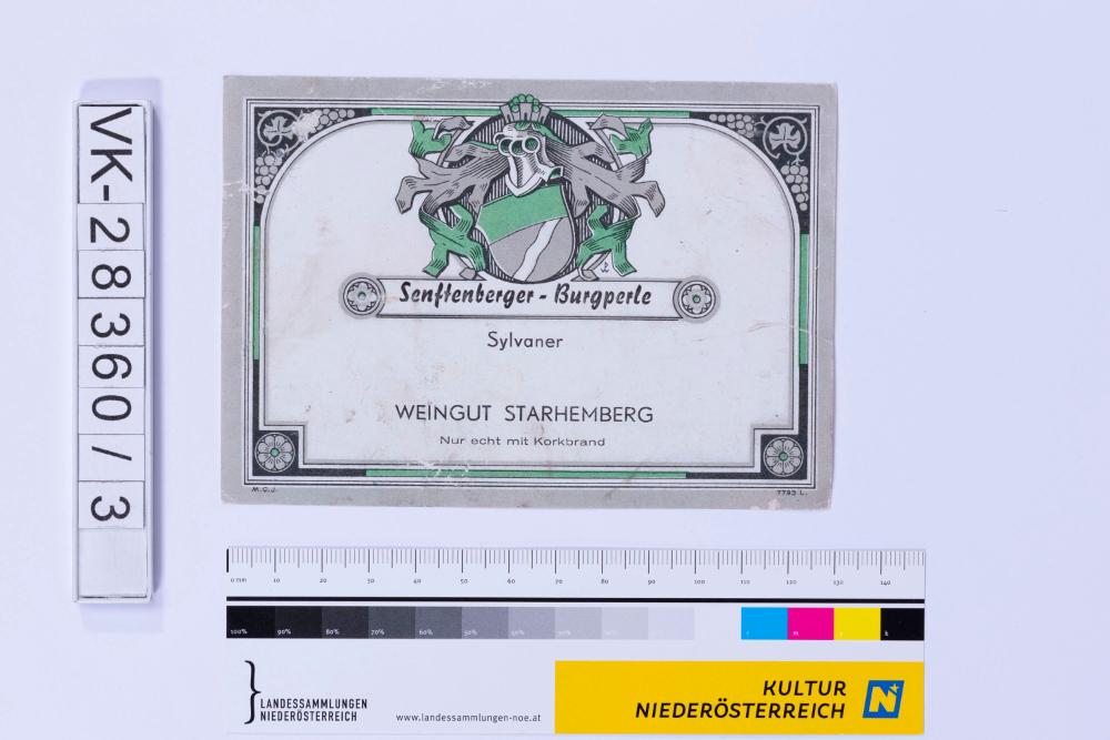 Abgelöstes Weinflaschenetikett aus einer Sammlung von den 1940er bis zu den frühen 1960er Jahren; Weinsorte: "Senftenberger-Burgperle Sylvaner", Wappendarstellung mit Helm und Weinreben; Weinbau, Kellerei bzw. Handel: "WEINGUT STARHEMBERG"; Beschriftung "Nur echt mit Korkbrand."