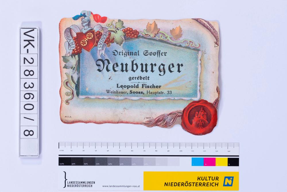 Abgelöstes Weinflaschenetikett aus einer Sammlung von den 1940er bis zu den frühen 1960er Jahren; Weinsorte: "Original Soosser Neuburger", Beschriftung "gerebelt", Wappendarstellung mit Helm, Banner "IN VINO VERITAS", Weinreben und Siegel; Weinbau, Kellerei bzw. Handel: "Leopold Fischer Weinhauer, Sooss, Hauptstr. 33"