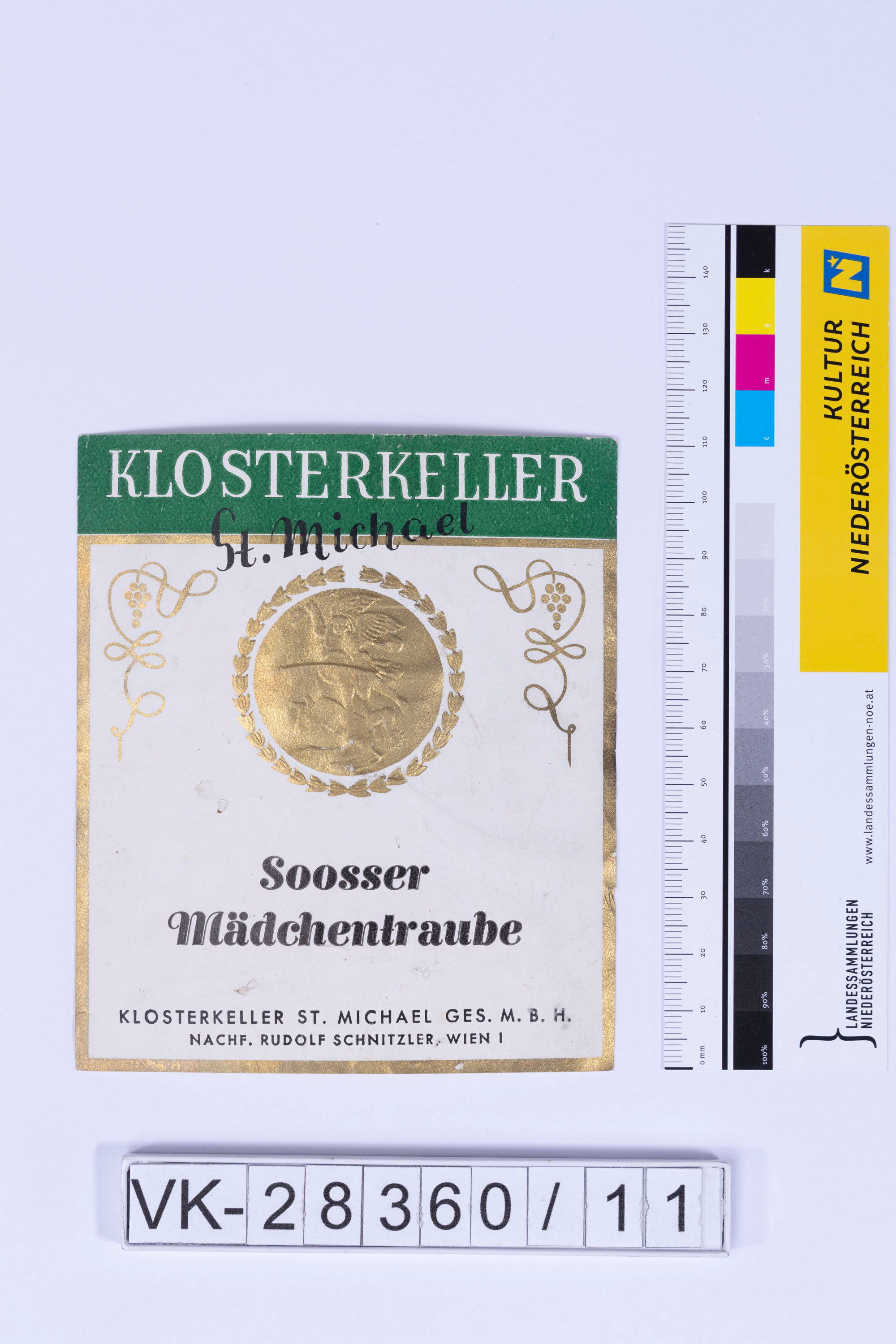 Abgelöstes Weinflaschenetikett aus einer Sammlung von den 1940er bis zu den frühen 1960er Jahren; Weinsorte: "Soosser Mädchentraube", Darstellung eines Engels mit Pfeil; Weinbau, Kellerei bzw. Handel: "KLOSTERKELLER ST.MICHAEL GES.M.B.H. NACHF. RUDOLF SCHNITZLER. WIEN I."