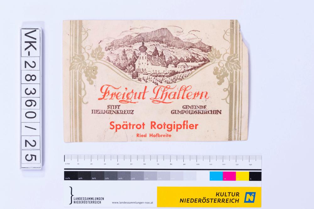 Abgelöstes Weinflaschenetikett aus einer Sammlung von den 1940er bis zu den frühen 1960er Jahren; Weinsorte: "Spätrot Rotgipfler", Beschriftung "Ried Hofbreite", Darstellung einer Kirche in einer ländlichen Szenerie, eingerahmt von Weinreben; Weinbau, Kellerei bzw. Handel: "Freigut Thallern STIFT HEILIGENKREUZ GEMEINDE GUMPOLDSKIRCHEN"