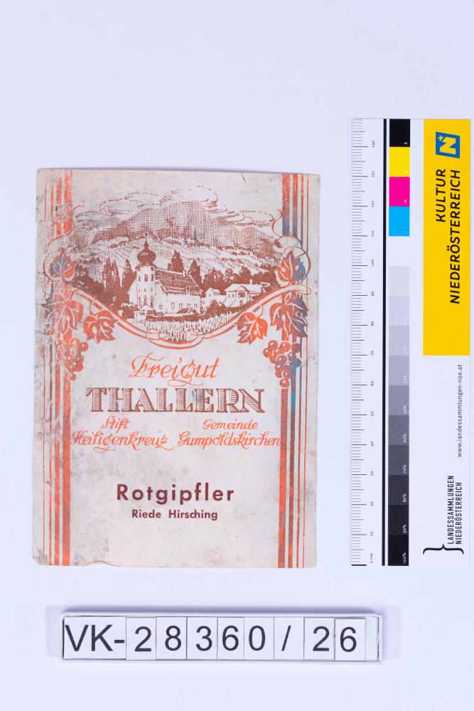 Abgelöstes Weinflaschenetikett aus einer Sammlung von den 1940er bis zu den frühen 1960er Jahren; Weinsorte: "Rotgipfler", Beschriftung "Riede Hirsching", Darstellung einer Kirche in einer ländlichen Szenerie, eingerahmt von Weinreben; Weinbau, Kellerei bzw. Handel: "Freigut Thallern Stift Heiligenkreuz Gemeinde Gumpoldskirchen"