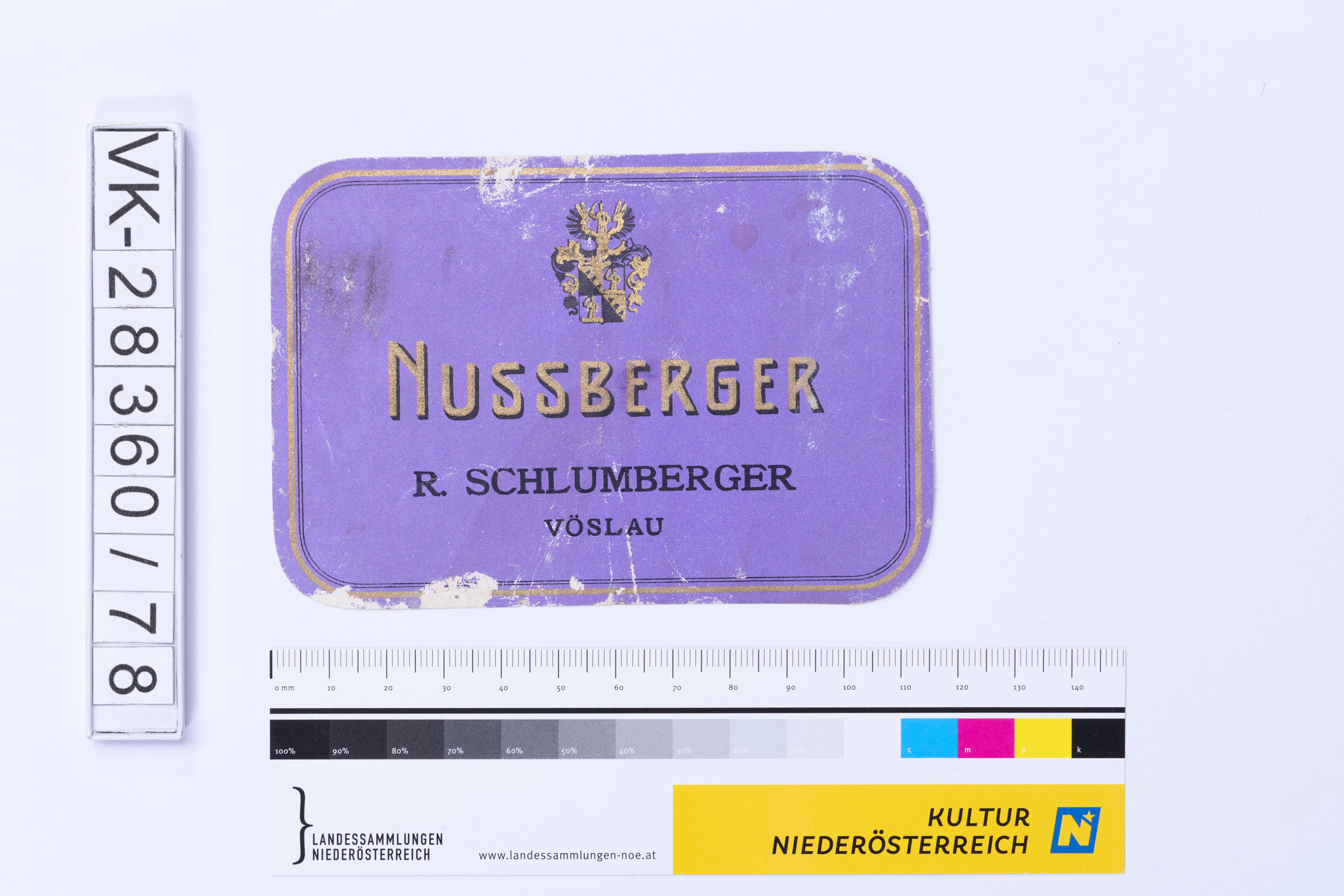 Abgelöstes Weinflaschenetikett aus einer Sammlung von den 1940er bis zu den frühen 1960er Jahren; Weinsorte: "NUSSBERGER", Wappendarstellung; Weinbau, Kellerei bzw. Handel: "R. SCHLUMBERGER VÖSLAU"
