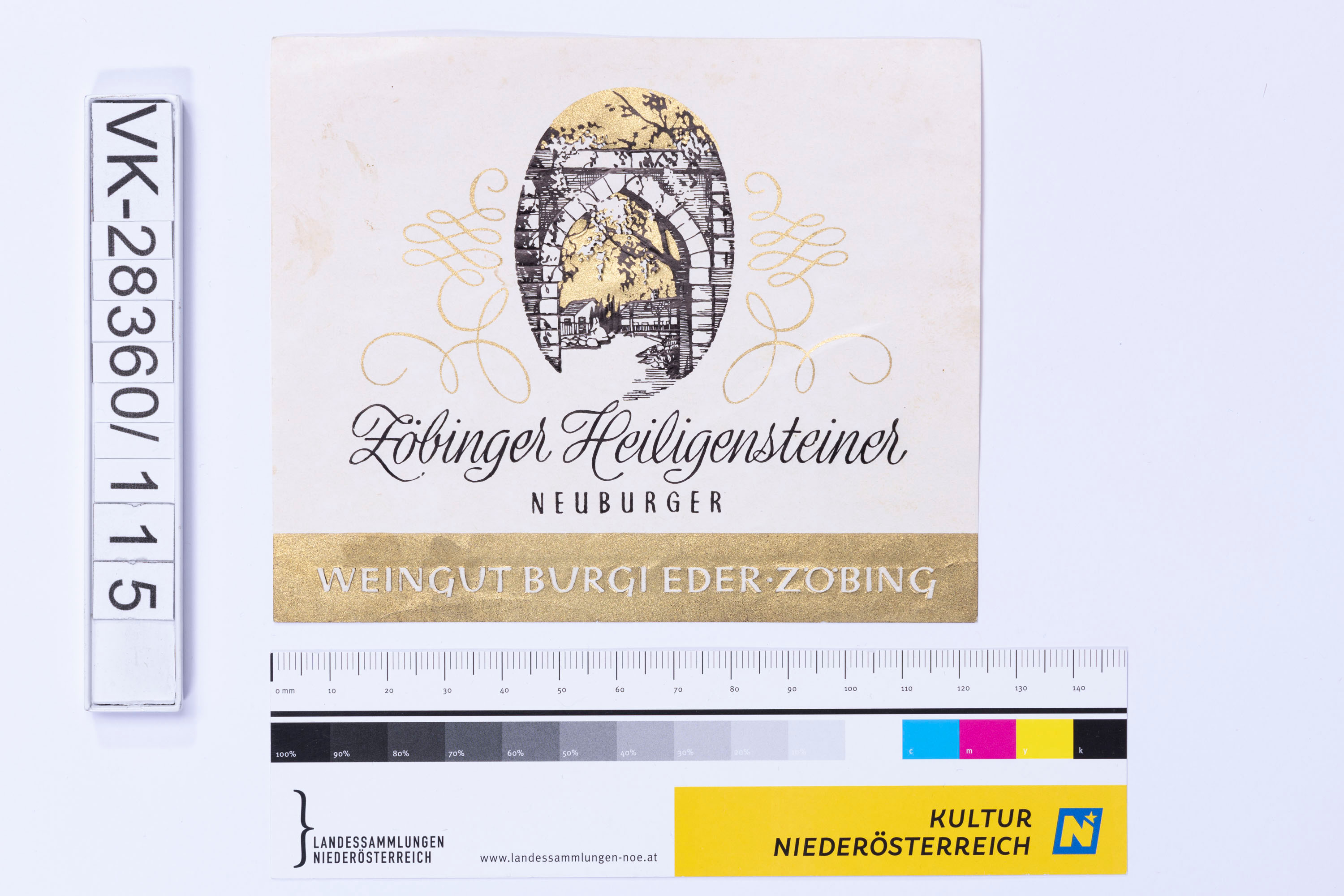 Abgelöstes Weinflaschenetikett aus einer Sammlung von den 1940er bis zu den frühen 1960er Jahren; Weinsorte: "Zöbinger Heiligensteiner NEUBURGER"; Darstellung von einem Dorf; Weinbau, Kellerei bzw. Handel: "WEINGUT BURGI EDER ZÖBING"