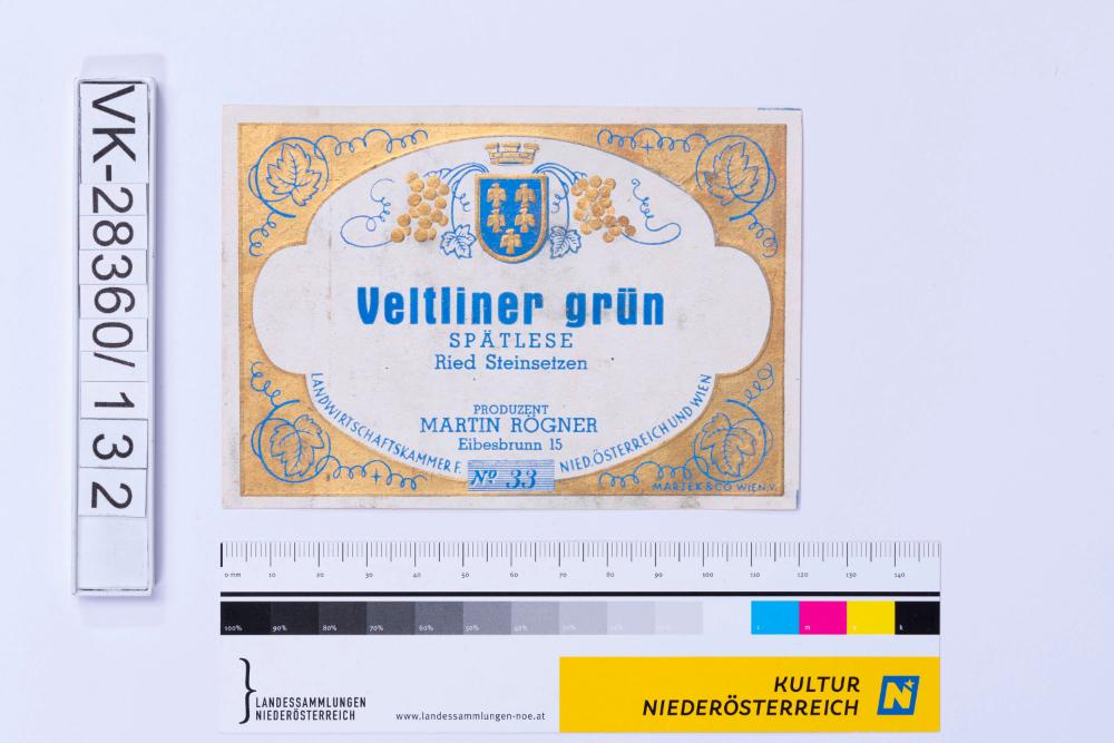 Abgelöstes Weinflaschenetikett aus einer Sammlung von den 1940er bis zu den frühen 1960er Jahren; Weinsorte: "Veltliner grün SPÄTLESE", Wappendarstellung mit Weinreben; Weinbau, Kellerei bzw. Handel: "PRODUZENT MARTIN RÖGNER Eibesbrunn 15"; Beschriftung "LANDWIRTSCHAFTSKAMMER F. Nr. 33 NIED.ÖSTERREICH UND WIEN"
