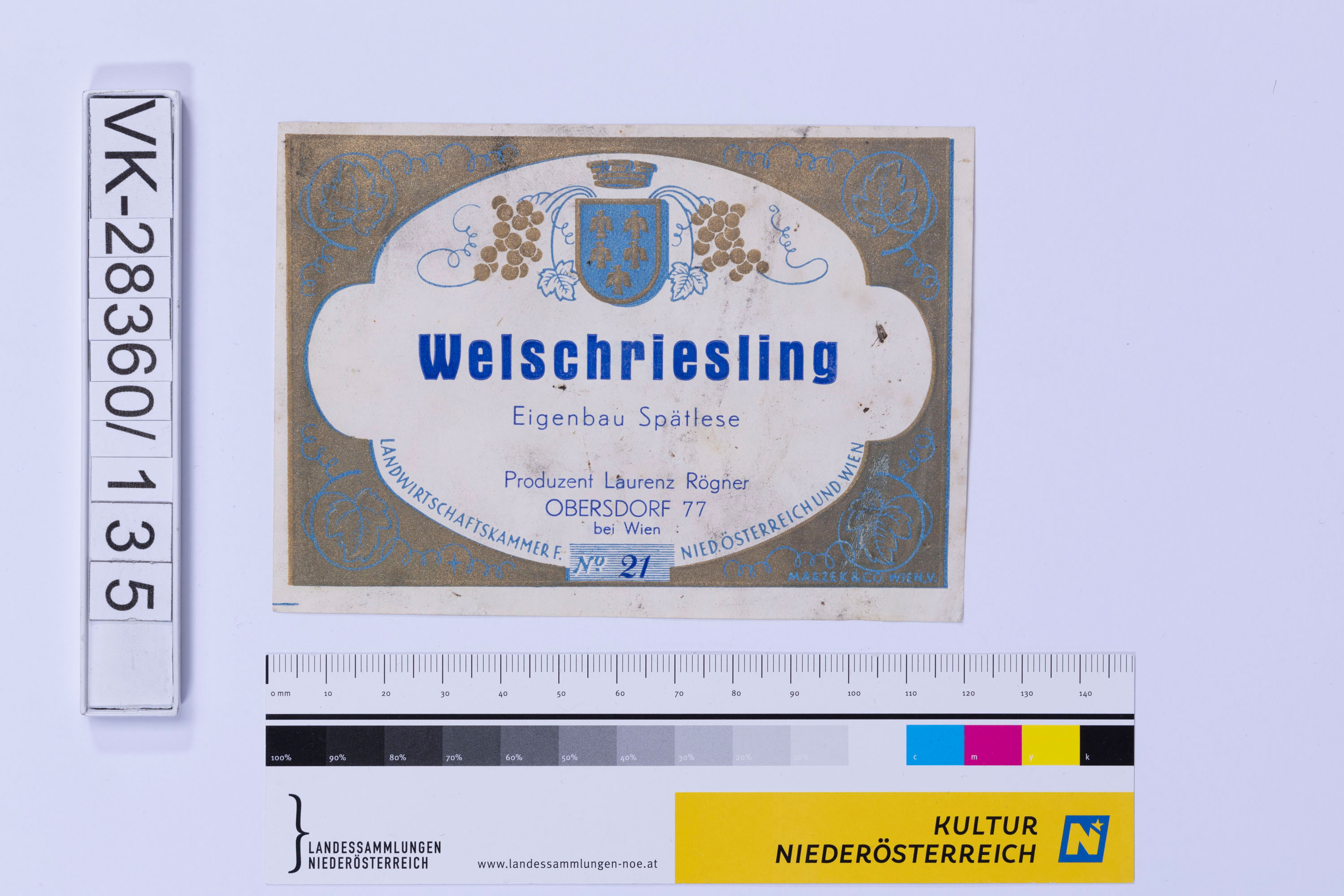 Abgelöstes Weinflaschenetikett aus einer Sammlung von den 1940er bis zu den frühen 1960er Jahren; Weinsorte: "Welschriesling", Wappendarstellung mit Weinreben; Weinbau, Kellerei bzw. Handel: "Produzent Laurenz Rögner OBERSDORF 77 bei Wien"; Beschriftung "LANDWIRTSCHAFTSKAMMER F. Nr. 21 NIED.ÖSTERREICH UND WIEN"