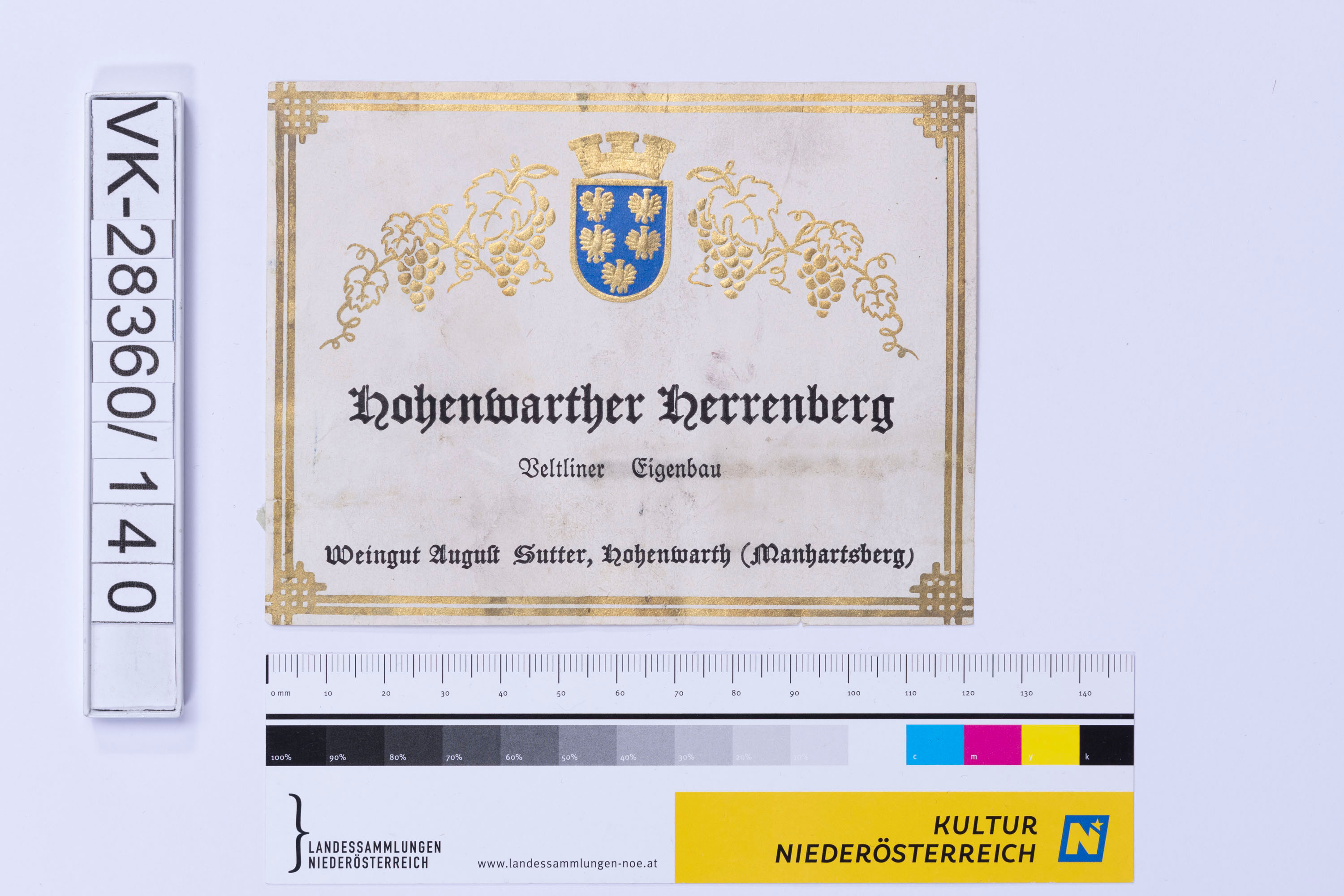 Abgelöstes Weinflaschenetikett aus einer Sammlung von den 1940er bis zu den frühen 1960er Jahren; Weinsorte: "Hohenwarther Herrenberg", Wappendarstellung mit Weinreben; Weinbau, Kellerei bzw. Handel: "Weingut August Sutter, Hohenwarth (Manhartsberg)"