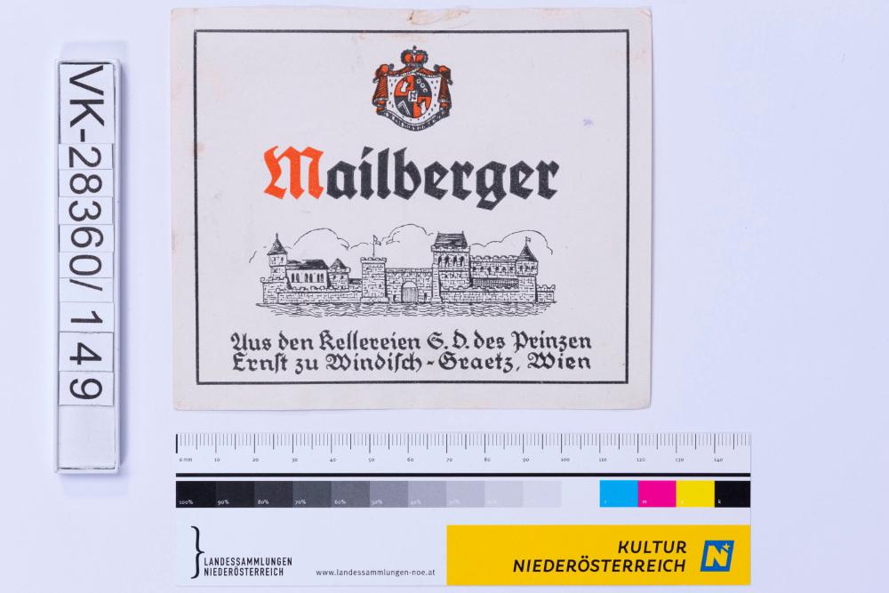 Abgelöstes Weinflaschenetikett aus einer Sammlung von den 1940er bis zu den frühen 1960er Jahren; Weinsorte: "Mailberger", Darstellung einer Burganlage mit Wappen; Weinbau, Kellerei bzw. Handel: "Aus den Kellereien S.D. des Prinzen Ernst zu Windisch-Graetz, Wien"