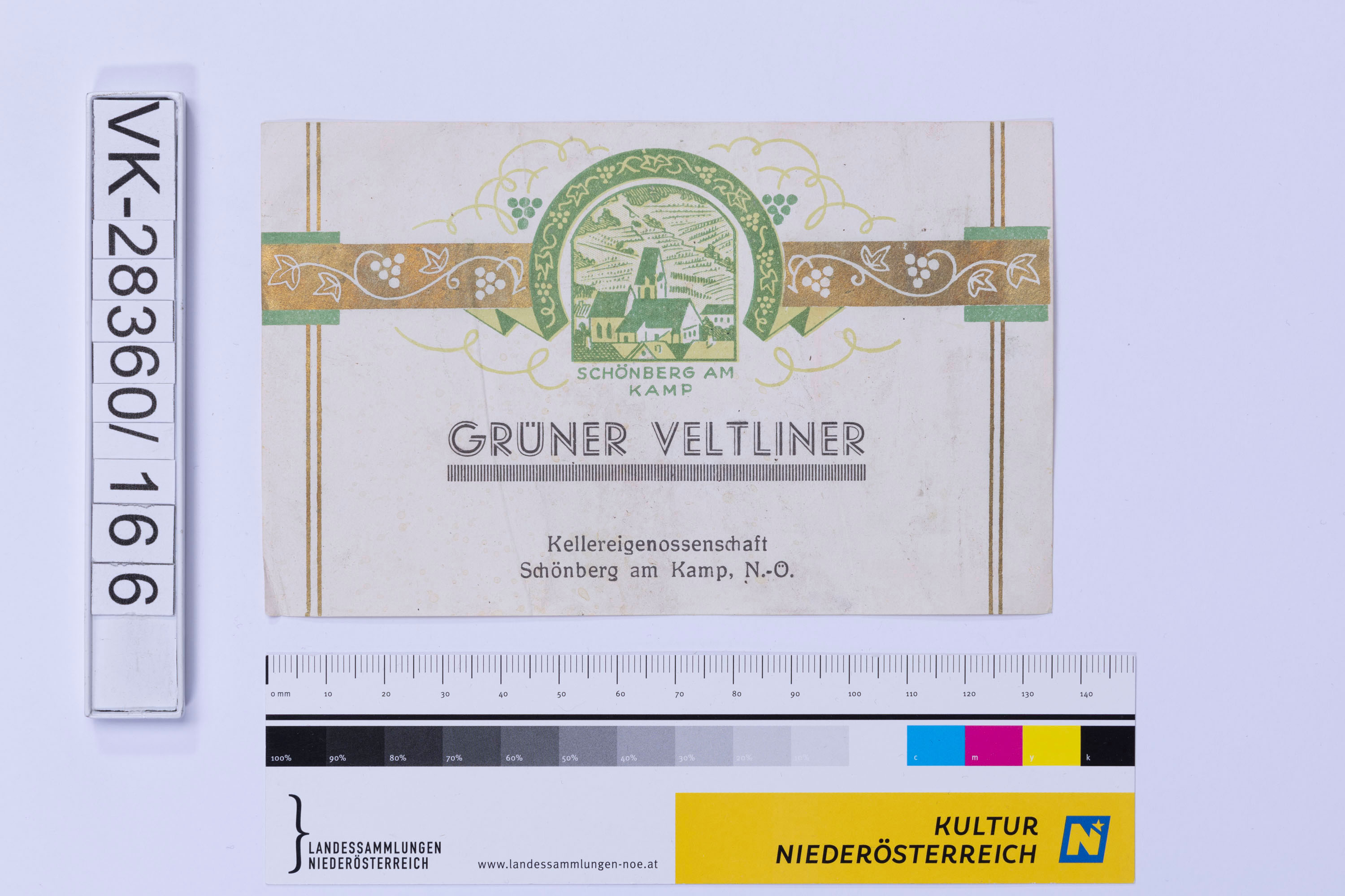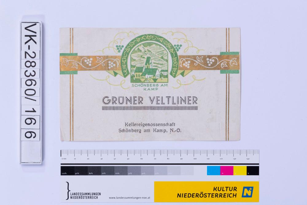 Abgelöstes Weinflaschenetikett aus einer Sammlung von den 1940er bis zu den frühen 1960er Jahren; Weinsorte: "GRÜNER VELTLINER", Dorfdarstellung mit Beschriftung "SCHÖNBERG AM KAMP"; Weinbau, Kellerei bzw. Handel: "Kellereigenossenschaft Schönberg am Kamp, N.Ö."