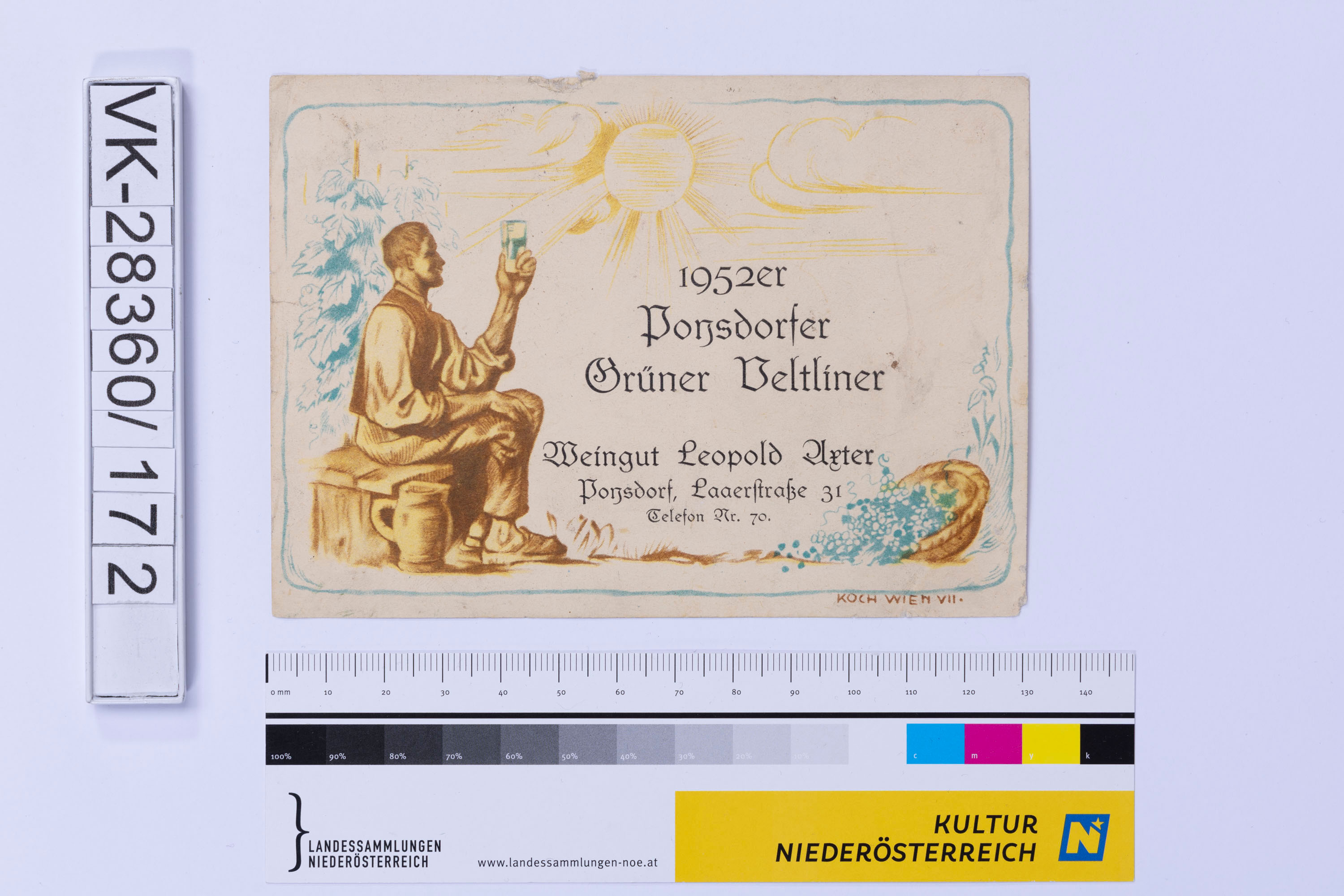 Abgelöstes Weinflaschenetikett aus einer Sammlung von den 1940er bis zu den frühen 1960er Jahren; Weinsorte: "1952er Poysdorfer Grüner Veltliner", Darstellung von einem Mann mit Weinglas; Weinbau, Kellerei bzw. Handel: "Weingut Leopold Arter Poysdorf, Laaerstraße 31 Telefon Nr. 70"