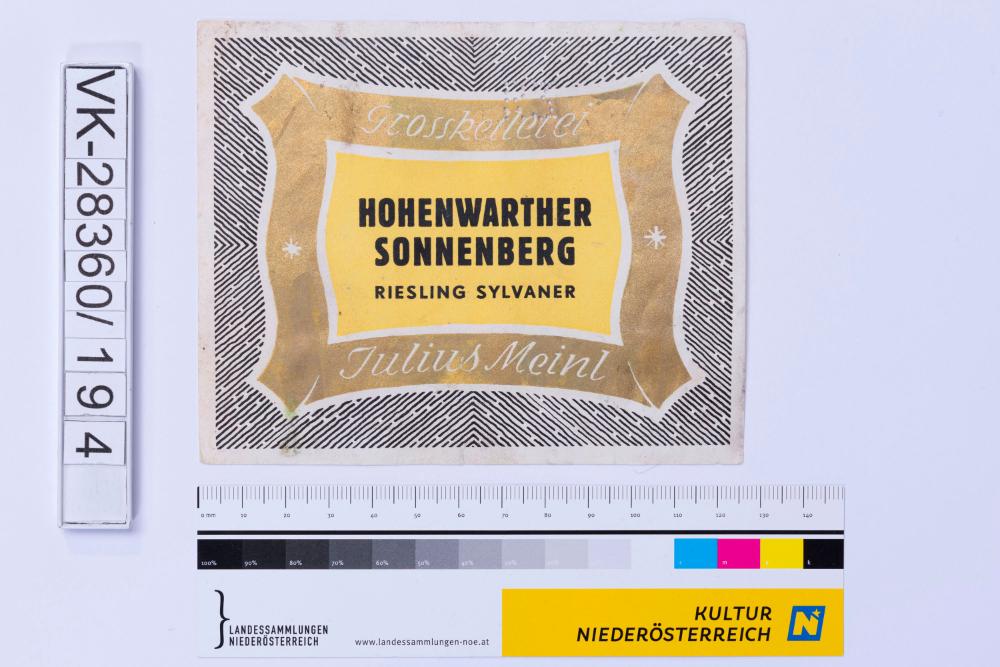 Abgelöstes Weinflaschenetikett aus einer Sammlung von den 1940er bis zu den frühen 1960er Jahren; Weinsorte: "HOHENWARTHER SONNENBERG RIESLING SYLVANER"; "Grosskellerei Julius Meinl"