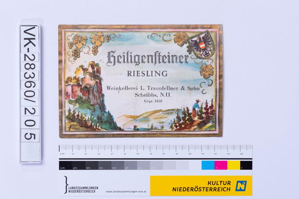 Abgelöstes Weinflaschenetikett aus einer Sammlung von den 1940er bis zu den frühen 1960er Jahren; Weinsorte: "Heiligensteiner RIESLING", Darstellung von Weinbergen und Winzer; Weinbau, Kellerei bzw. Handel: "Weinkellerei L. Traunfellner & Sohn Scheibbs, N.Ö. Gegr. 1828"