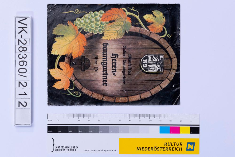 Abgelöstes Weinflaschenetikett aus einer Sammlung von den 1940er bis zu den frühen 1960er Jahren; Weinsorte: "Herrnbaumgartner", Wappendarstellung mit Weinfass und -reben; Weinbau, Kellerei bzw. Handel: "Weinkellerei Robert Baumgartner"