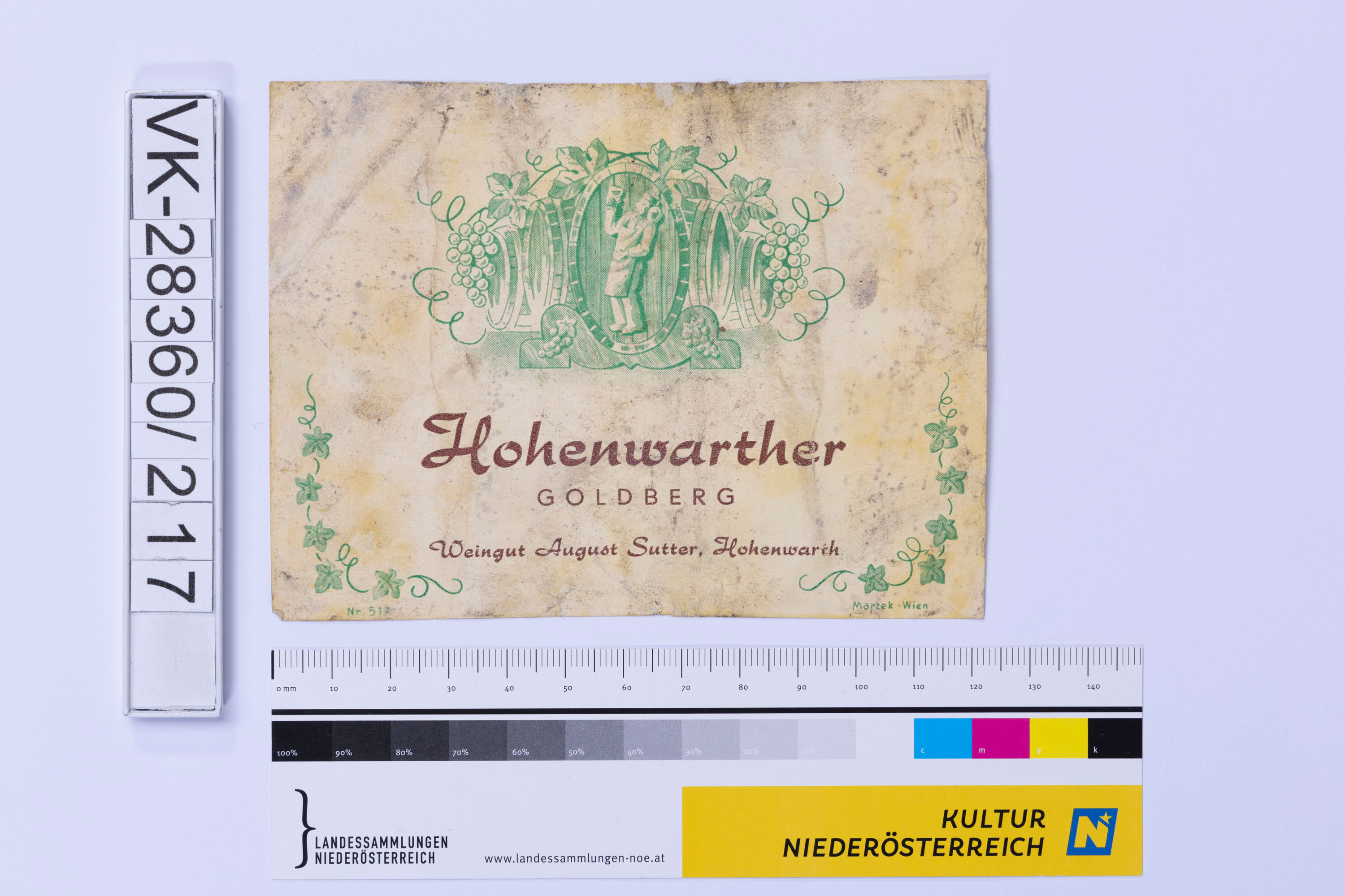 Abgelöstes Weinflaschenetikett aus einer Sammlung von den 1940er bis zu den frühen 1960er Jahren; Weinsorte: "Hohenwarther GOLDBERG", Darstellung von Weinfässern mit Weinreben; Weinbau, Kellerei bzw. Handel: "Weingut August Sutter, Hohenwarth"