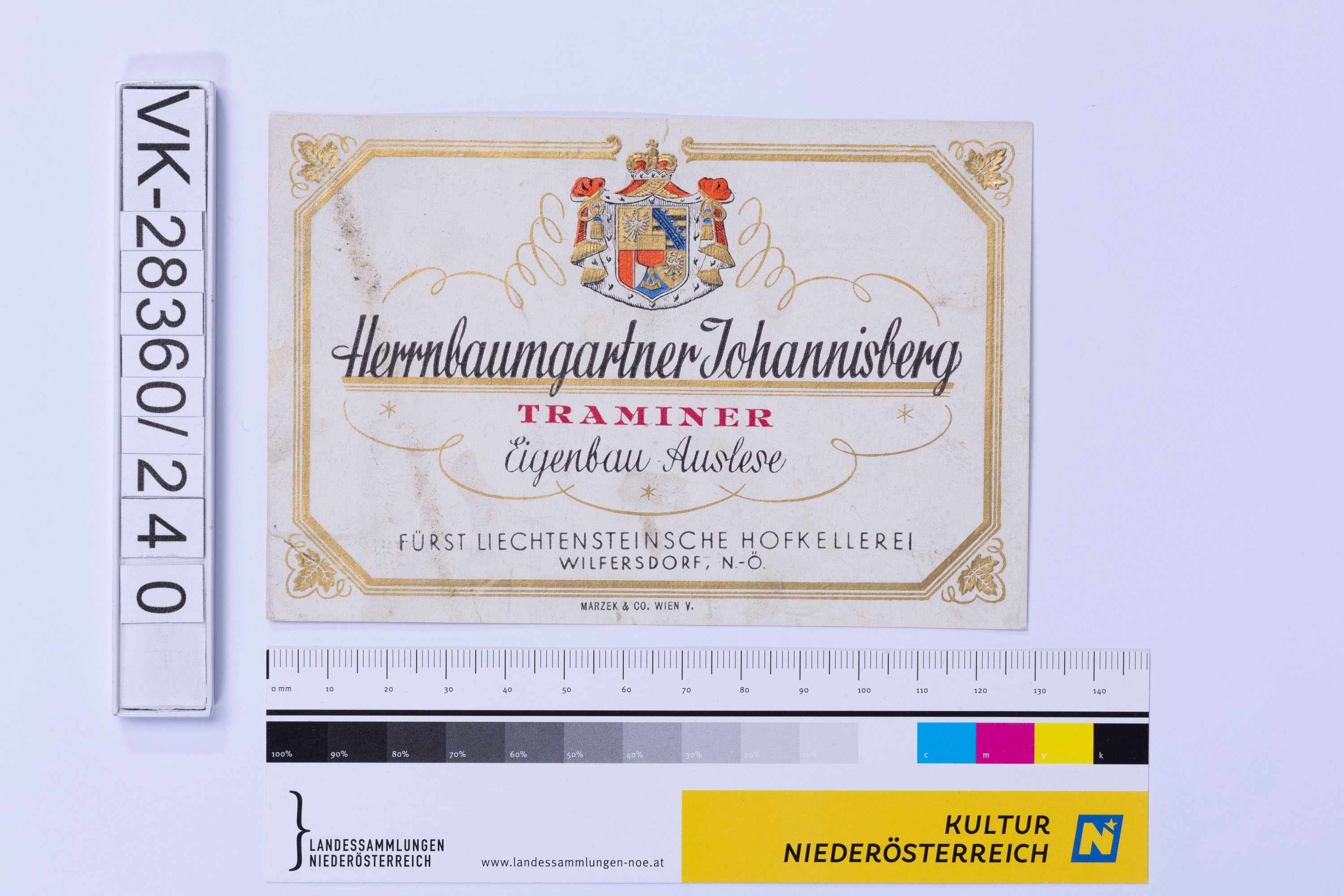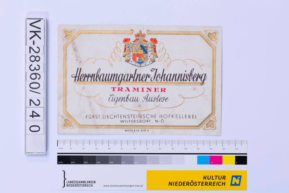Abgelöstes Weinflaschenetikett aus einer Sammlung von den 1940er bis zu den frühen 1960er Jahren; Weinsorte: "Herrnbaumgartner Johannisberg TRAMINER", Beschriftung "Eigenbau Auslese", Darstellung von einem Wappen mit Krone; Weinbau, Kellerei bzw. Handel: "FÜRST ´LIECHTENSTEINISCHE HOFKELLEREI WILFERSDORF; N.-Ö."