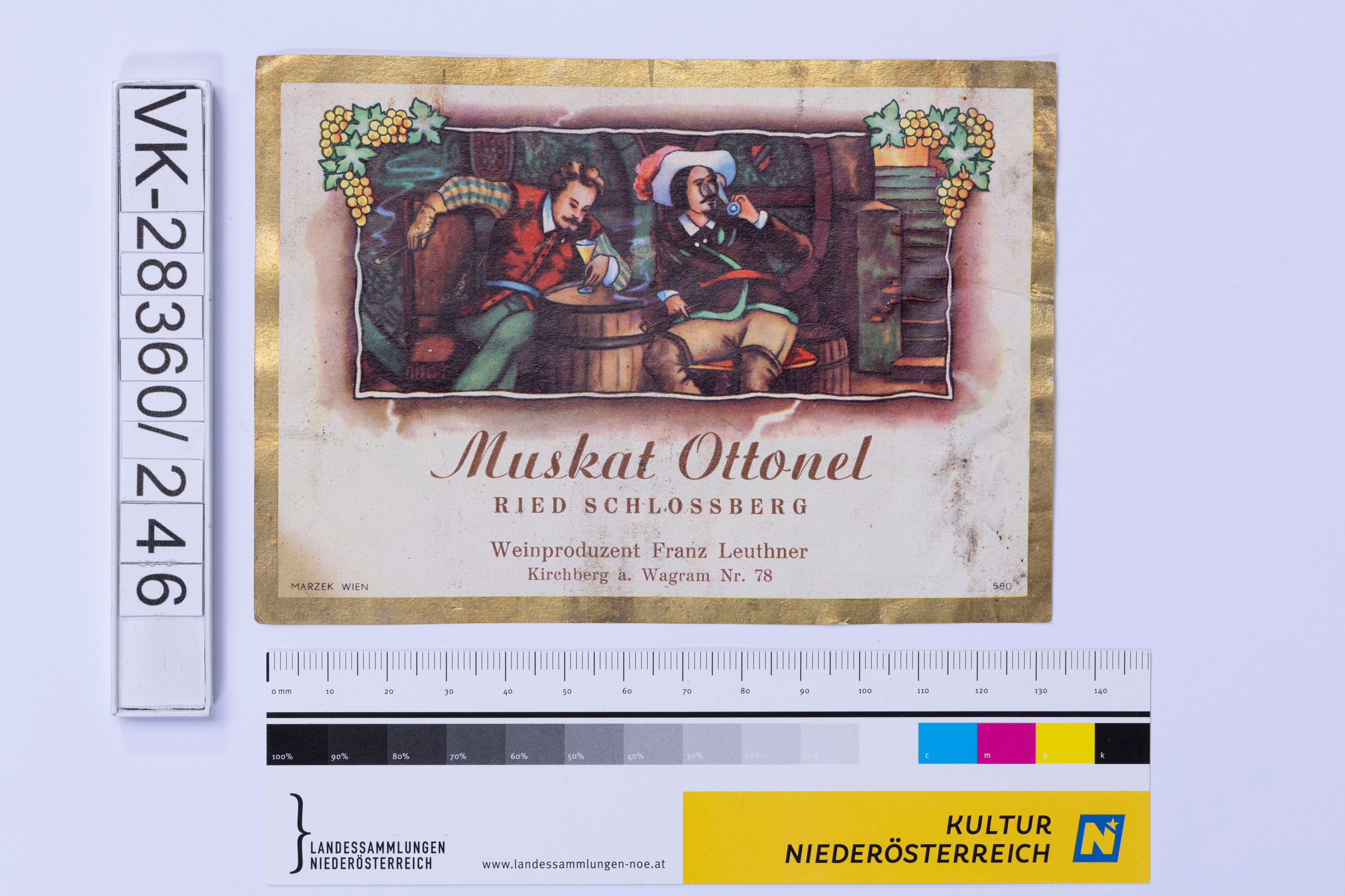 Abgelöstes Weinflaschenetikett aus einer Sammlung von den 1940er bis zu den frühen 1960er Jahren; Weinsorte: "Muskat Ottonel ", Darstellung von zwei Edelmännern im Weinkeller"; Weinbau, Kellerei bzw. Handel: "RIED SCHLOSSBERG Weinproduzent Franz Leuthner Kirchberg a. Wagram Nr. 78"