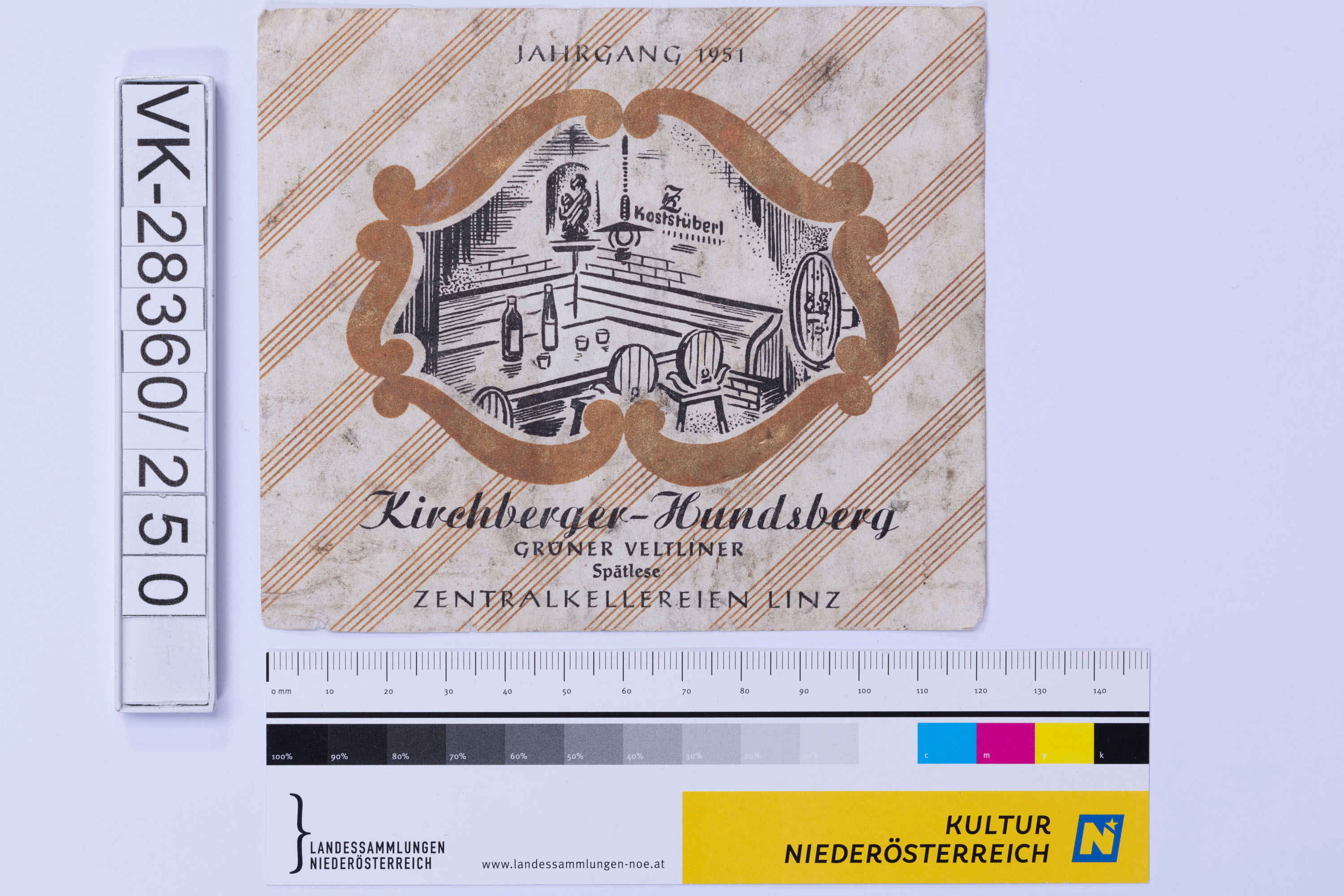 Abgelöstes Weinflaschenetikett aus einer Sammlung von den 1940er bis zu den frühen 1960er Jahren; Weinsorte: "Kirchberger-Hundsberg GRÜNER VELTLINER Spätlese", Darstellung von einem Stüberl; Weinbau, Kellerei bzw. Handel: "ZENTRALKELLEREI LINZ"