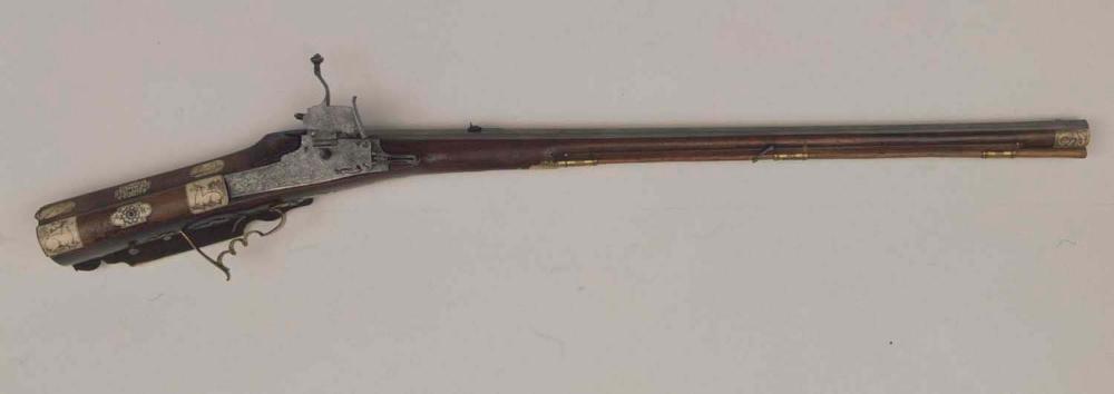 Radschlossbüchse mit zugehörigem Ladestock. Einlegearbeiten aus schwarz graviertem Bein.