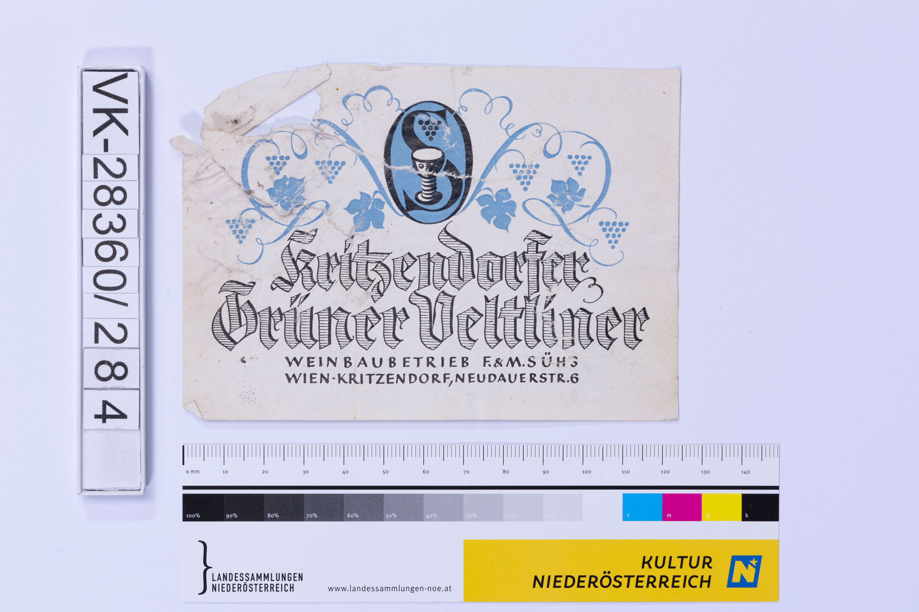 Abgelöstes Weinflaschenetikett aus einer Sammlung von den 1940er bis zu den frühen 1960er Jahren; Weinsorte: "Kritzendorfer Grüner Veltliner", Markenzeichen mit Weinreben; Weinbau, Kellerei bzw. Handel: "WEINBAUBETRIEB F.&M.SÜHS WIEN-KRITZENDORF, NEUDAUERSTR.6"