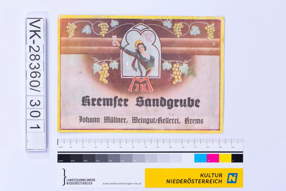 Abgelöstes Weinflaschenetikett aus einer Sammlung von den 1940er bis zu den frühen 1960er Jahren; Weinsorte: "Kremser Sandgrube", Frau mit Weinglas, eingefasst von Weinreben; Weinbau, Kellerei bzw. Handel: "Johann Müllner, Weingut/Kellerei, Krems"