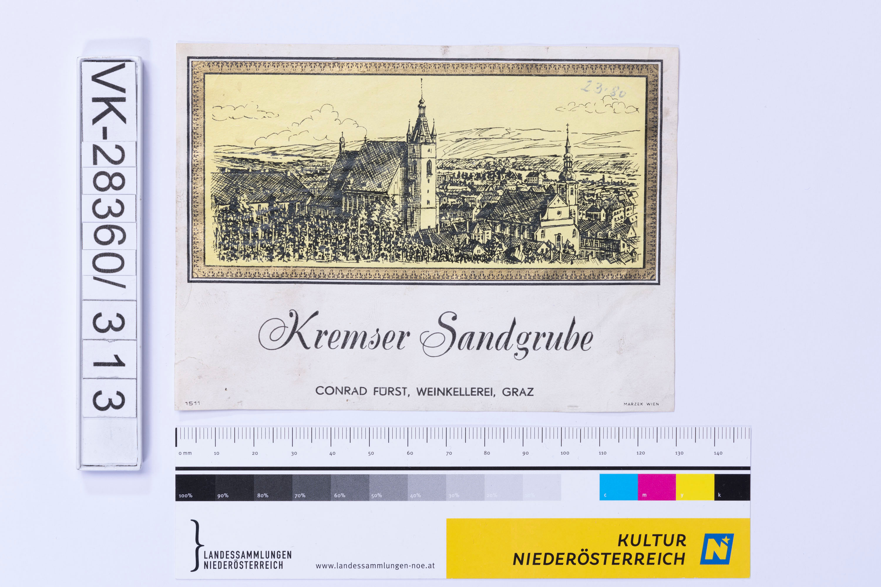 Abgelöstes Weinflaschenetikett aus einer Sammlung von den 1940er bis zu den frühen 1960er Jahren; Weinsorte: "Kremser Sandgrube", Stadtansicht; Weinbau, Kellerei bzw. Handel: "CONRAD FÜRST, WEINKELLEREI, GRAZ"