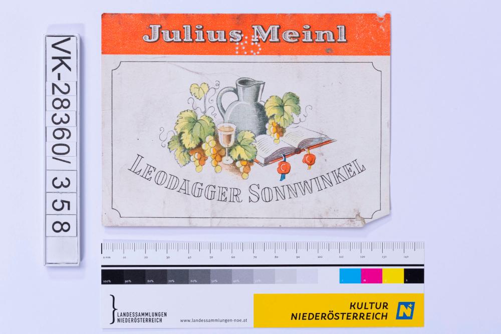 Abgelöstes Weinflaschenetikett aus einer Sammlung von den 1940er bis zu den frühen 1960er Jahren; Weinsorte: "LEODAGGER SONNWINKEL", Darstellung von einem Buch, Weinkrug,- glas und -reben; "Julius Meinl"