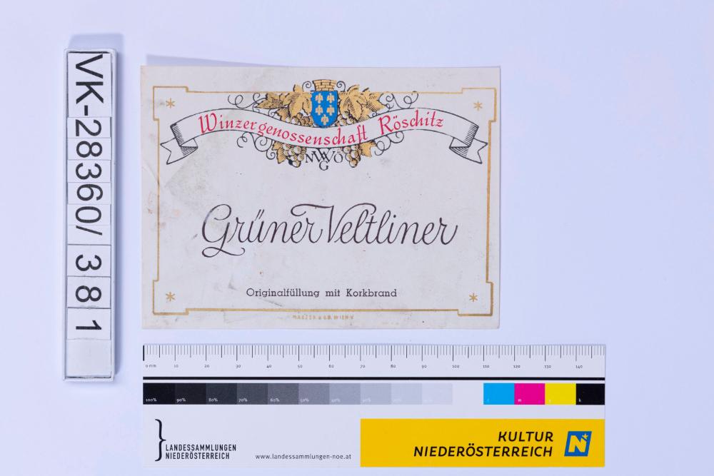 Abgelöstes Weinflaschenetikett aus einer Sammlung von den 1940er bis zu den frühen 1960er Jahren; Weinsorte: "Grüner Veltliner", Wappendarstellung mit Weinreben; Weinbau, Kellerei bzw. Handel: "Winzergenossenschaft Röschitz"