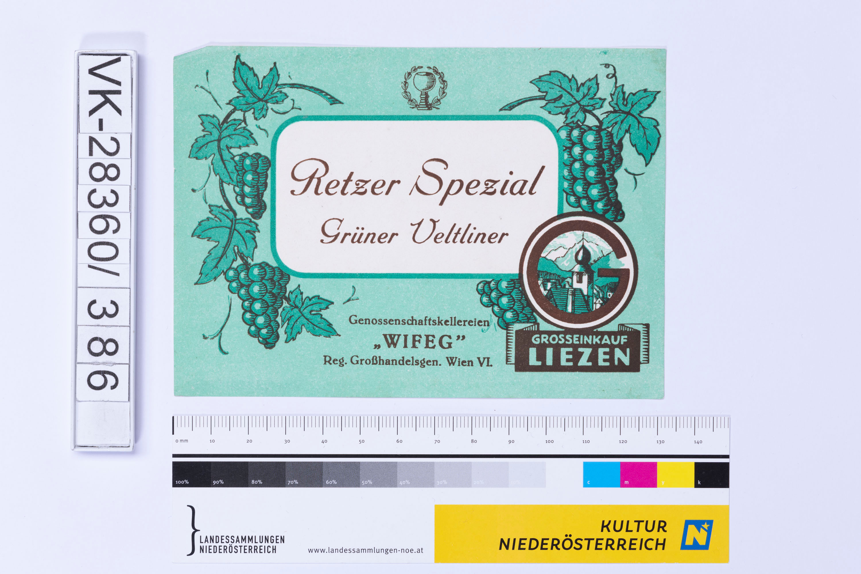 Abgelöstes Weinflaschenetikett aus einer Sammlung von den 1940er bis zu den frühen 1960er Jahren; Weinsorte: "Retzer Spezial Grüner Veltliner"; Weinreben; Weinbau, Kellerei bzw. Handel: "Genossenschaftskellereien "WIFEG" Reg. Großhandelsgen. Wien VI."